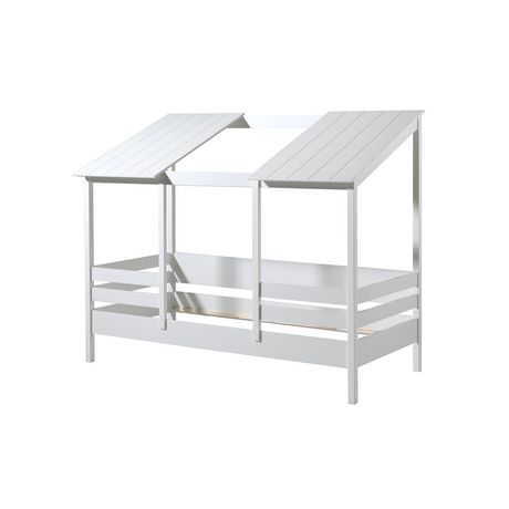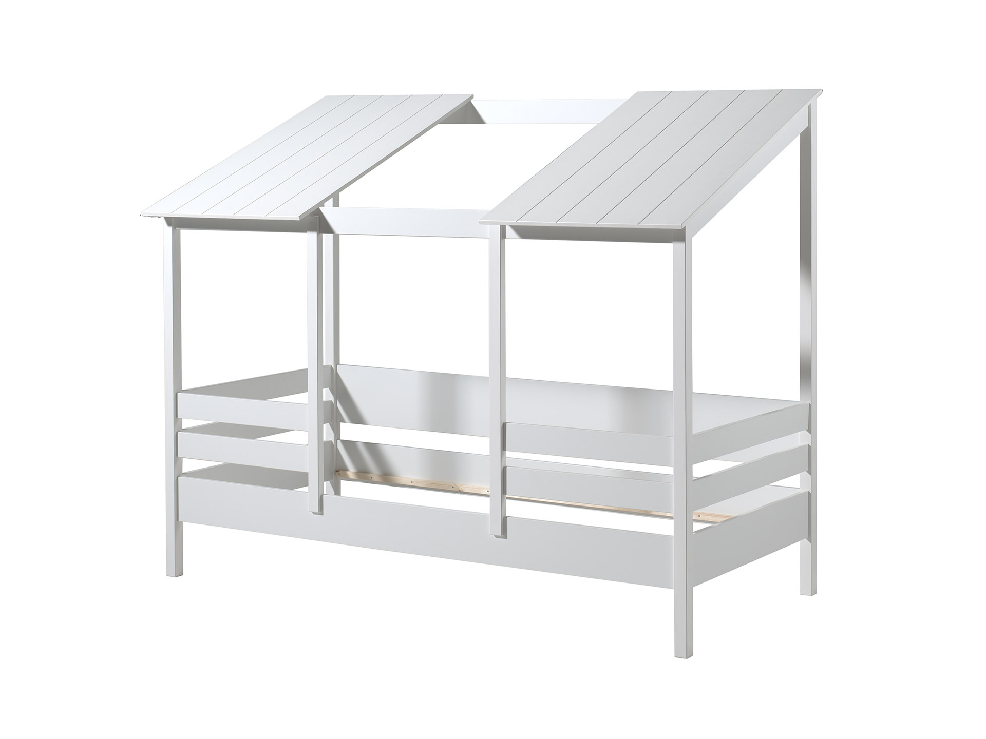 Ce lit de maison est un endroit idéal pour dormir et jouer. Le matériau de support est du bois massif et du MDF de haute qualité peint en blanc. Le plan de couchage, avec une hauteur d'entrée d'environ 36 cm, a une bordure horizontale sur les côtés et à l'avant de 66 cm de haut. Un joli détail qui souligne l'aspect de la maison, ainsi que les entretoises vers le toit. Cela contribue également à un niveau élevé de stabilité avec les montants de lit continus. Le toit est ouvert au milieu (largeur environ 71,2 cm), les éléments fermés à droite et à gauche ont des fraisages verticaux et ne peuvent être installés que dans la position spécifiée. Attention: le toit ne doit pas être escaladé. La zone de couchage est accessible par l'entrée de 68 cm de large. La hauteur libre à l'avant est d'environ 87,8 cm. En raison de la faible hauteur d'entrée, le lit est facilement accessible et offre toujours un dégagement au sol d'environ 2 cm. Le lit n'a pas de sommier à lattes dans la livraison et convient pour un sommier à lattes fixe ou un sommier à lattes à rouleaux. La profondeur d'insertion du sommier à lattes et du matelas est d'environ 12 cm. Le toit incliné vers l'avant a une hauteur maximale d'environ 174 cm et d'environ 125 cm à l'avant. Le dossier a un panneau jusqu'au niveau de la bordure, au-dessus duquel le lit est ouvert. Les produits sont de haute qualité et les accessoires sont en métal. Le sommier à lattes, le matelas et la décoration ne sont pas compris dans la livraison. Les marchandises sont démontées, avec des instructions de montage pour un auto-assemblage facile. Empreinte env.: L: 214,2 x H: 174 x P: 15,3 cm.