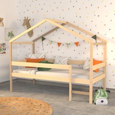 Le lit cabane ELIO pour enfant 90x190 cm en bois massif, offre un espace ludique et sécurisé. Livré avec sommier, barrière et échelle, il est disponible en blanc ou brut. Ce lit charmant ELIO est fabriqué en Union européenne, garantissant qualité et design pour une chambre enfant enchantée.