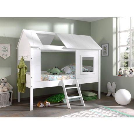 Le lit mi-hauteur Charlotte est modelé sur une cabane dans les arbres et est un endroit idéal pour dormir et jouer. Le support est en MDF de haute qualité peint en blanc. Les montants de lit continus offrent une grande stabilité. Les fraisages dans les assemblages individuels sont également intéressants, ils donnent un aspect typique des maisons dans les arbres. La surface de couchage est de 90 x 200 cm et facilement accessible via la petite échelle, qui a une position fixe au milieu du lit. La hauteur de couchage est d'environ 65 cm. La garde au sol d'environ 48 cm sous le lit peut être utilisée pour ranger des jouets. Le lit ne comprend pas de sommier à lattes et convient pour un sommier à lattes fixe. La profondeur d'insertion du sommier à lattes et du matelas est d'environ 12 cm. Côté tête et pieds, le lit possède une fenêtre de 88 cm de large et 32 ??cm de haut. Un porte-manteau avec 5 crochets est déjà inclus. Il est idéal pour les vestes, les peignoirs ou les sacs. La grande entrée du lit est à l'avant (dimensions env.: L: 97 x H: 71 cm). À côté, à droite, une fenêtre avec un cadre de 40 x 40 cm. Le toit a deux grandes ouvertures décalées en diagonale. Attention: le toit ne doit pas être grimpé. Le lit est ouvert vers l'arrière. Les marchandises sont de haute qualité et les raccords sont en métal. Le sommier à lattes, le matelas, les rideaux et la décoration ne sont pas inclus. Les marchandises sont démontées, avec des instructions de montage pour un auto-assemblage facile. Surface au sol environ: L: 209 x H: 185 x P: 137 cm.