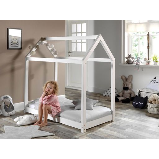Lit cabane enfant avec surface de couchage en 70 x 140 cm. Les montants de lit (60 x 40 mm) et la structure du toit sont en pin massif peint en blanc. La construction stable caractérise l'article. Le lit est déjà livré avec un sommier à lattes. Puisqu'il est vissé sur les bandes de support du cadre, il y a également une distance par rapport au sol, ce qui permet à l'air de circuler. La profondeur d'insertion du matelas est d'environ 5 cm. La garde au sol est d'environ 2,5 cm. À l'avant, le bord du toit a une hauteur de 103 cm et s'élève à une hauteur totale de 142 cm. La distance du sol au bord supérieur du lit est d'environ 12 cm. Les marchandises sont de haute qualité et stables. Les raccords sont en métal. Le matelas et la décoration ne sont pas inclus. Les marchandises sont démontées, avec des instructions de montage pour un auto-assemblage facile. Surface au sol environ: L: 146 x H: 142 x P: 78 cm.