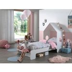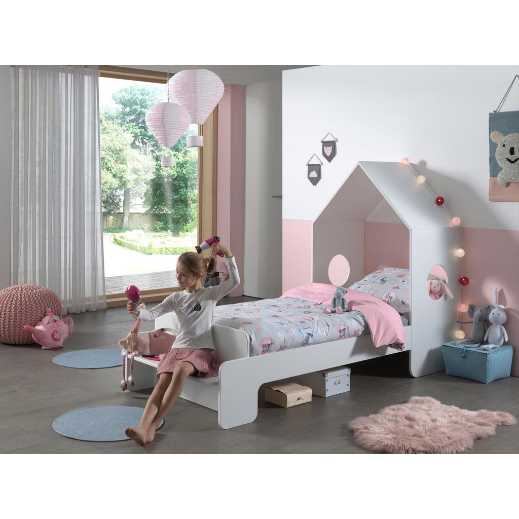 Lit cabane enfant original couchage 90 x 200 cm et un petit banc. . Le cadre à lattes avec 15 bandes (68 x 16 mm) est déjà inclus dans la livraison. Le matériau MDF de haute qualité est peint en blanc et les bords du lit sont tous arrondis. Un très joli détail est la petite superstructure de toit sur la partie tête avec les deux découpes rondes d'un diamètre de 25 cm. Le panneau de tête de lit a une hauteur d'environ 50 cm, au-dessus de laquelle le lit est ouvert. Les côtés du lit sont ainsi solidement liés à la structure et offrent ainsi un haut niveau de stabilité pour le lit. La profondeur d'insertion du matelas est d'environ 10 cm et la garde au sol de 20 cm est suffisante pour ranger des objets encore plus petits en dessous. Le petit banc a une surface d'environ: L: 90 x P: 25 cm. Le petit dossier (23,5 cm de haut) sert bien de dossier. Le matelas et la décoration ne sont pas inclus. Les marchandises sont démontées, avec des instructions de montage pour un auto-assemblage facile. Surface au sol environ: L: 229,5 x H: 147,6 x P: 93,6 cm.