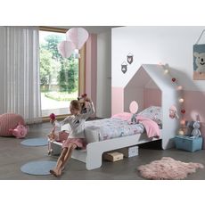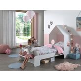 Le lit Alex allie esprit cabane avec son toit ouvert et côté pratique grâce au petit banc inclus. Original, les bords et toute la structure du lit est arrondie pour un look doux et épuré. L'espace sous le lit permettra d'y ranger jouets et boites.