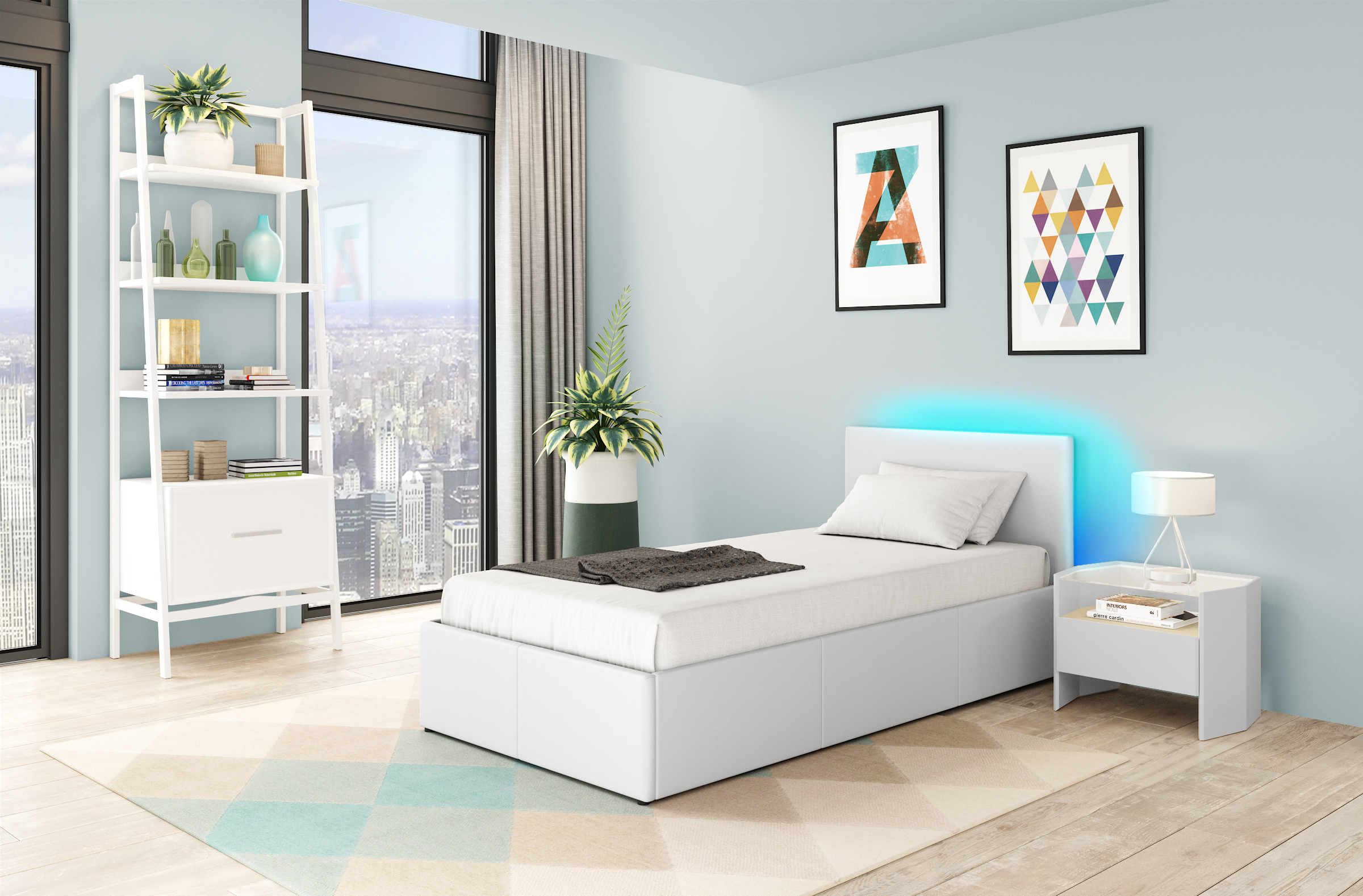 La lumiere LED multicolore à télécommande située derriere la tete de lit permet d'apporter de la lumiere indirecte et douce, pour la lecture ou pour une couleur d'ambiance. Le système de coffre permet de ranger vos couettes, oreillers… ou autres affaires.