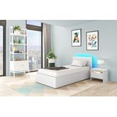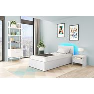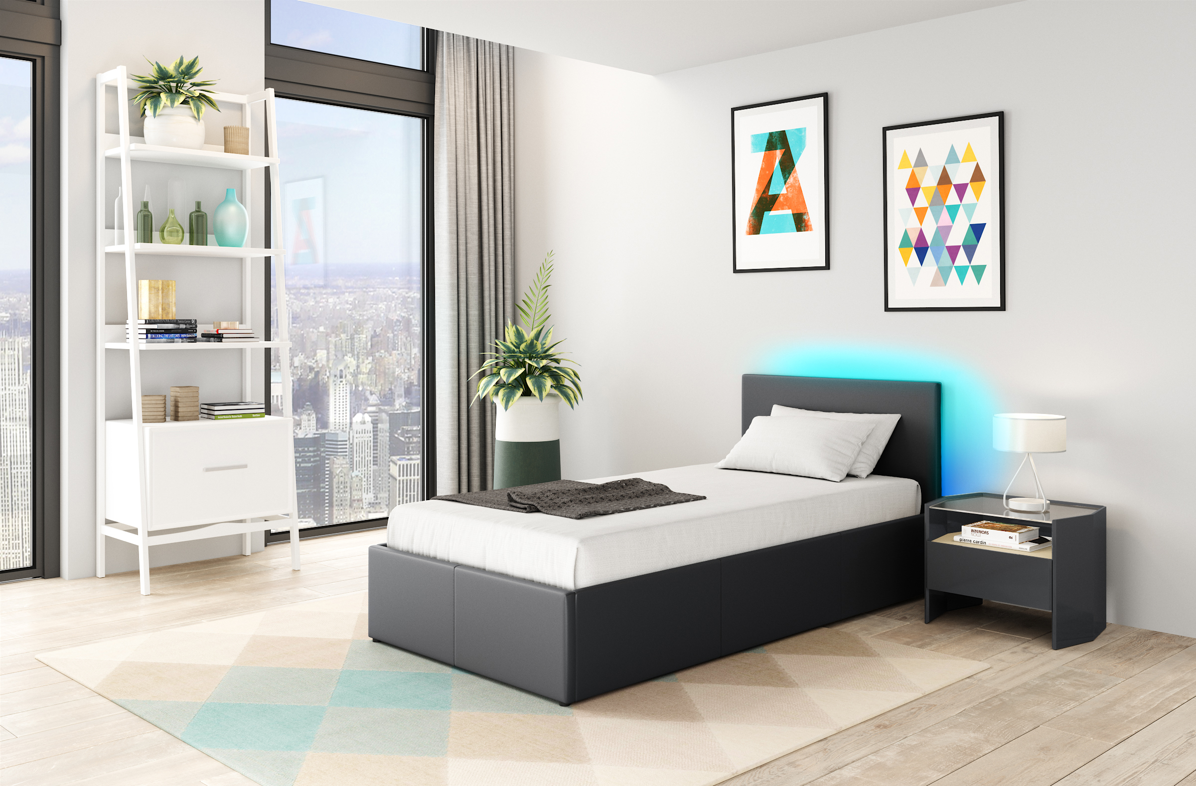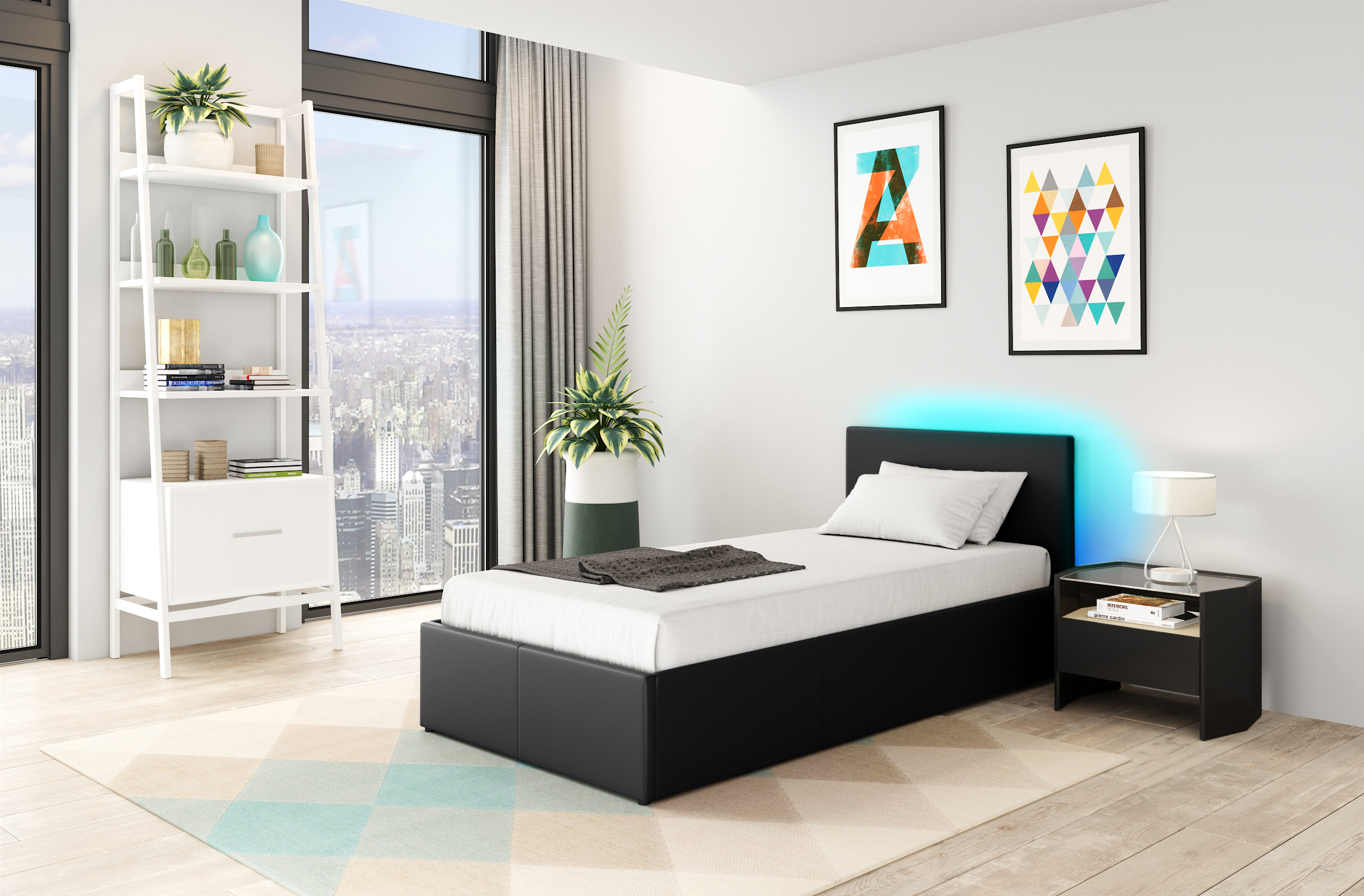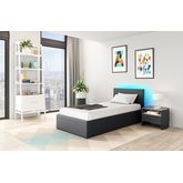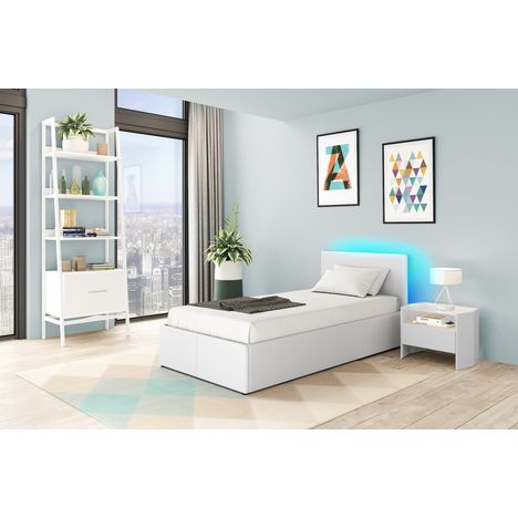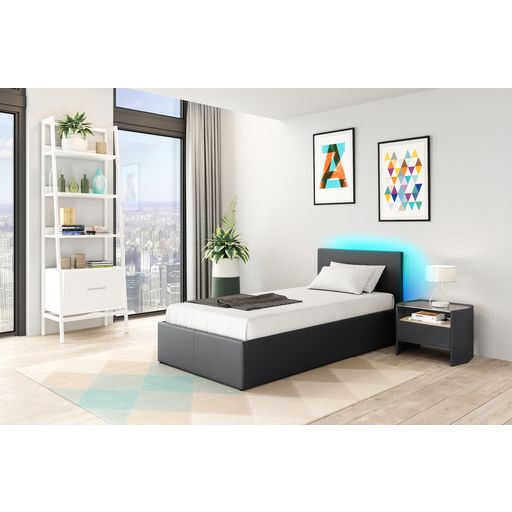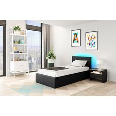 Lit coffre avec système sommier relevable sans effort (par verins à gaz) -Sommier à lattes en bois massif multiplis lattes incluses (a clipser à la structure) et tête de lit inclus. Systeme LED lumiere présente derriere la tête de lit bande LED 16 couleurs avec télécommande de controle à distance, fonctionne sous secteur 220v normes CE ROHS. Pas de fond de coffre - structure en panneaux de particules et bois massif + metal - S'adapte à tout type de matelas, le lit s'actionne avec un matelas installé. Stockage important, permet de ranger sous votre lit pour un gain d'espace. Lit 1 personne 90xL190 cm. Revetement Pu simili 100% polyurethane très agreable et facile d'entretien