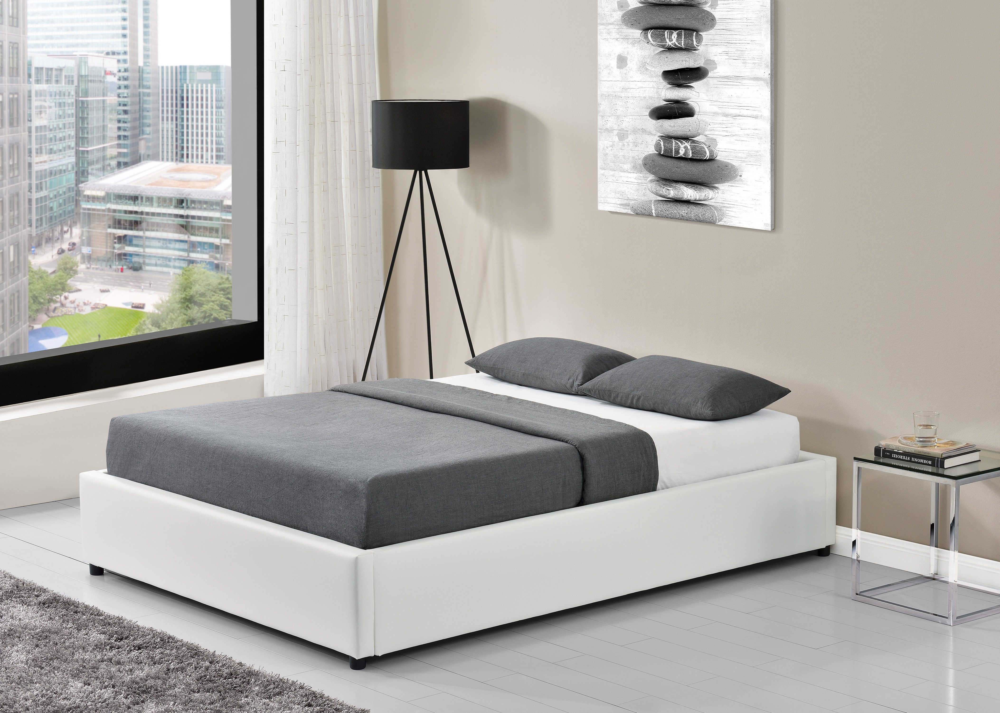 Tendance avec son revêtement en simili noir ou blanc, le lit coffre LEO vous offre un grand coffre de rangement logé sous le sommier, idéal pour ranger vos affaires. Existe en plusieurs tailles et différents coloris.