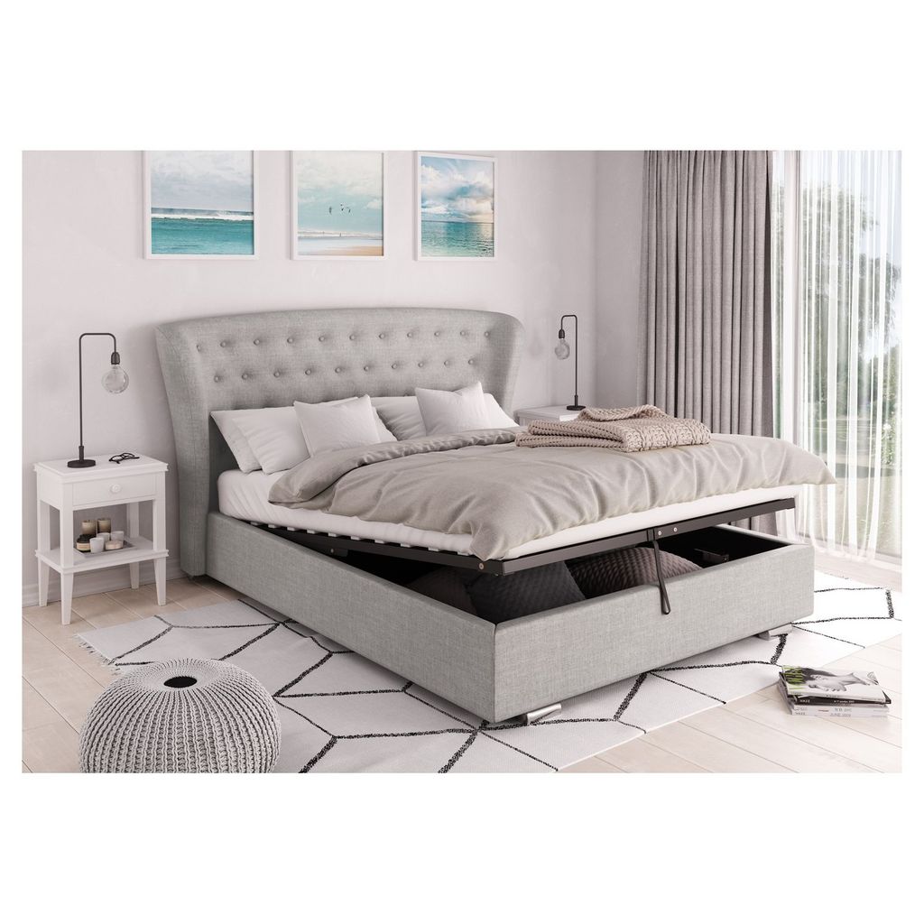 lit coffre avec sommier relevable et tête de lit arrondie capitonnée en tissu gris clair 140x190 cm DUC