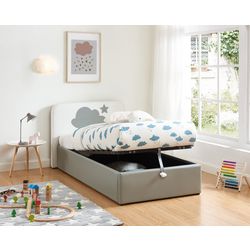 Le lit enfant Nuage avec tête de lit garantit un confort pour de douces nuits à votre petit. En rose et gris ou blanc et gris, son revêtement tissu au motif nuages habillera parfaitement la chambre d'un enfant. L'originalité de ce couchage une personne est le coffre permettant d'obtenir du rangement supplémentaire dans votre pièce grâce à son sommier relevable.
