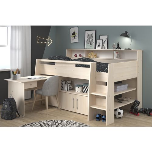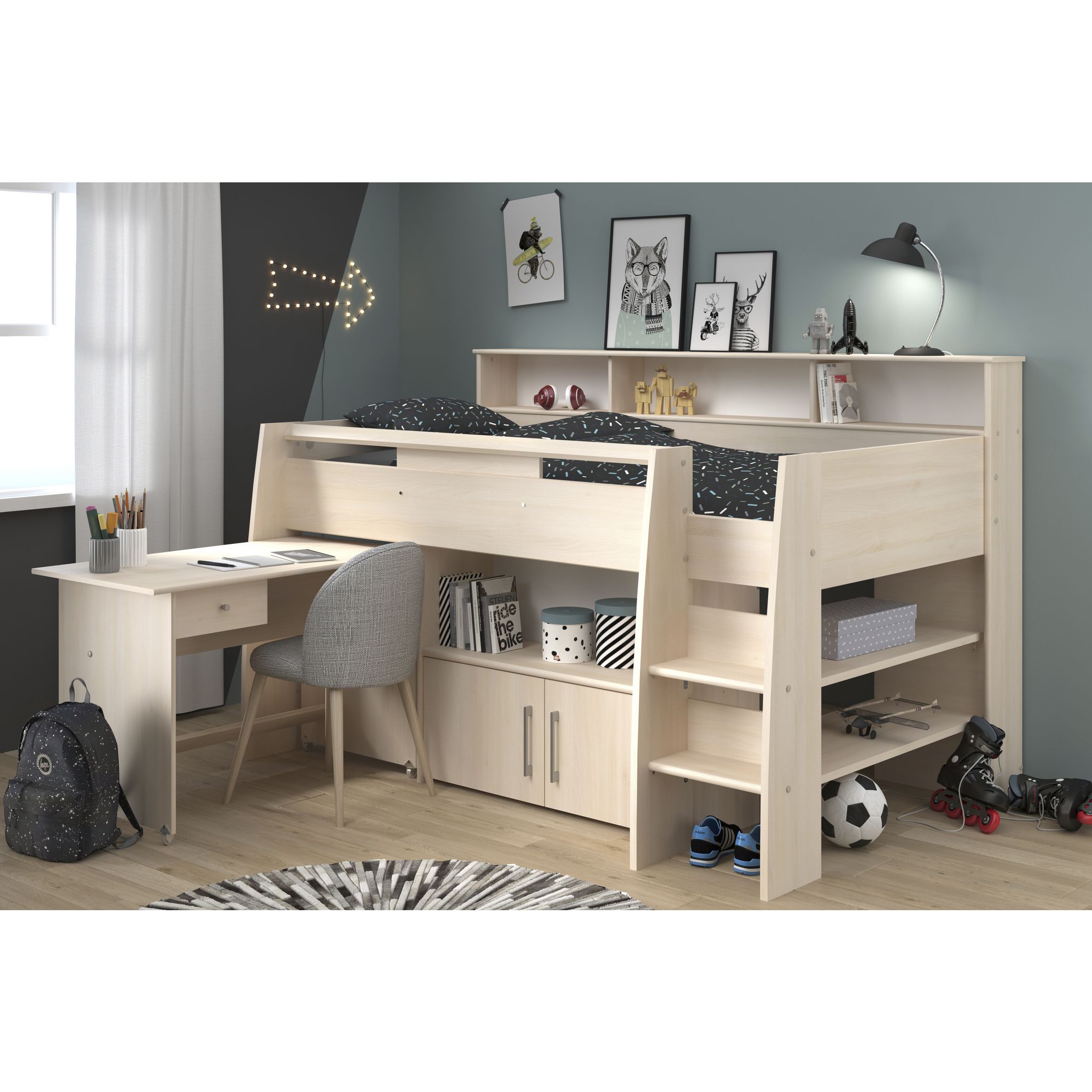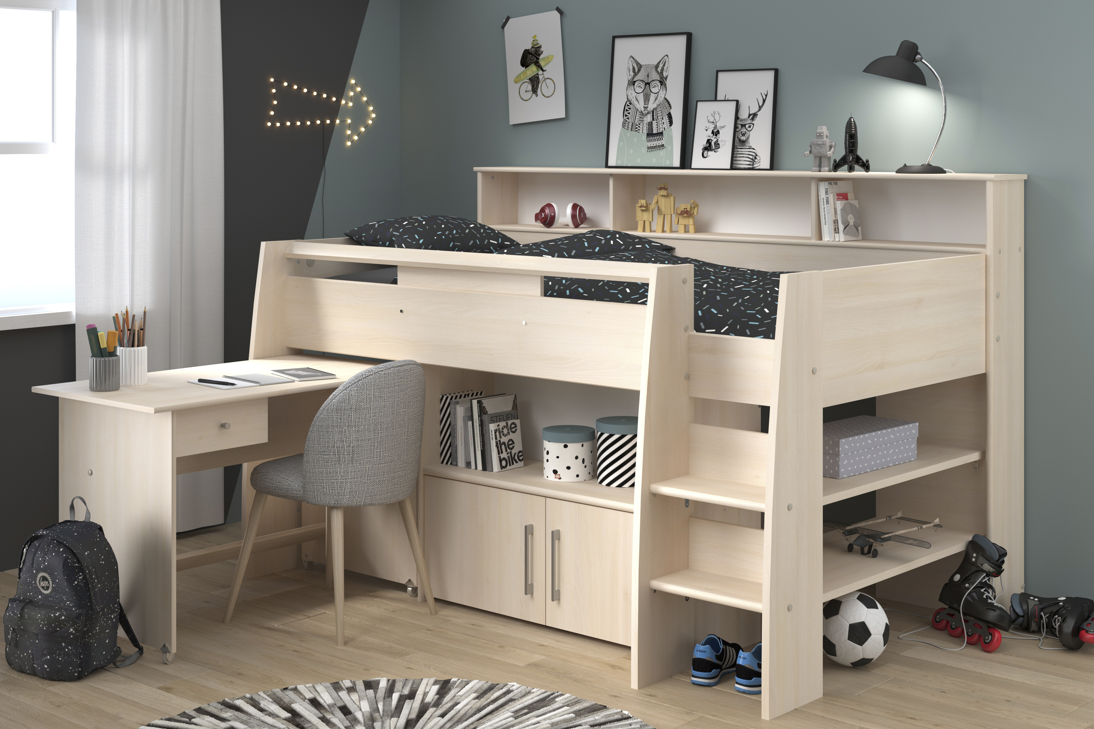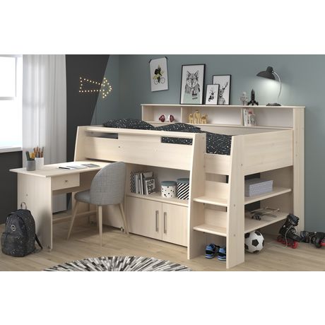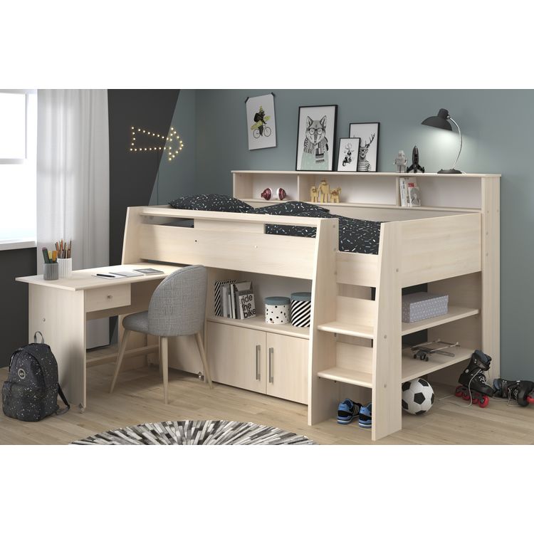 Le lit combiné Mathieu est idéal pour enfant ou ado, à la recherche d'espace de rangement et bureau à la fois. Pratique ce bureau muni de roulettes, se glisse très facilement sous le lit pour gagner de la place dans la chambre. Fabriqué en France, ce lit combiné dispose de nombreux rangements et permet un couchage confortable en hauteur.