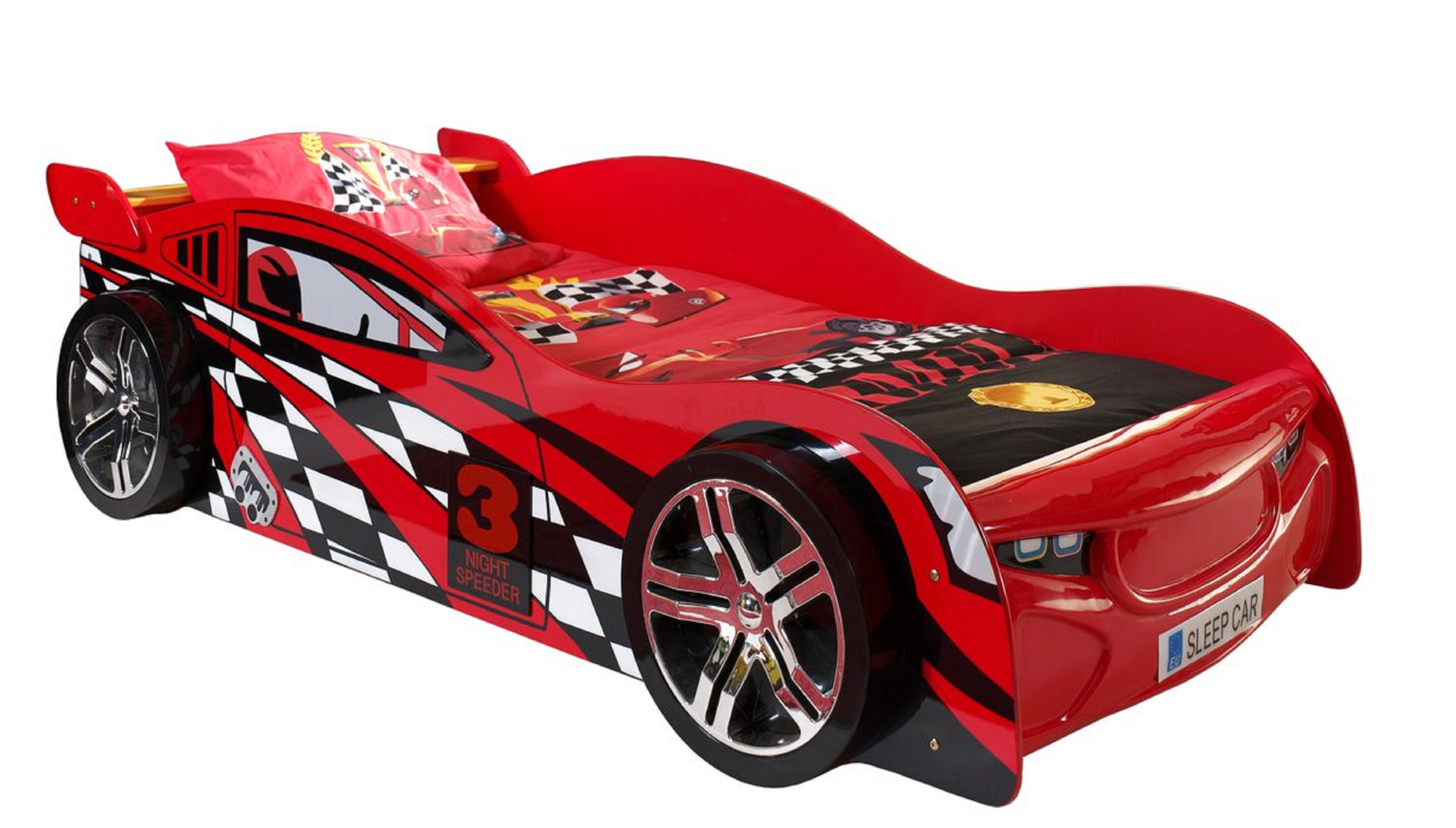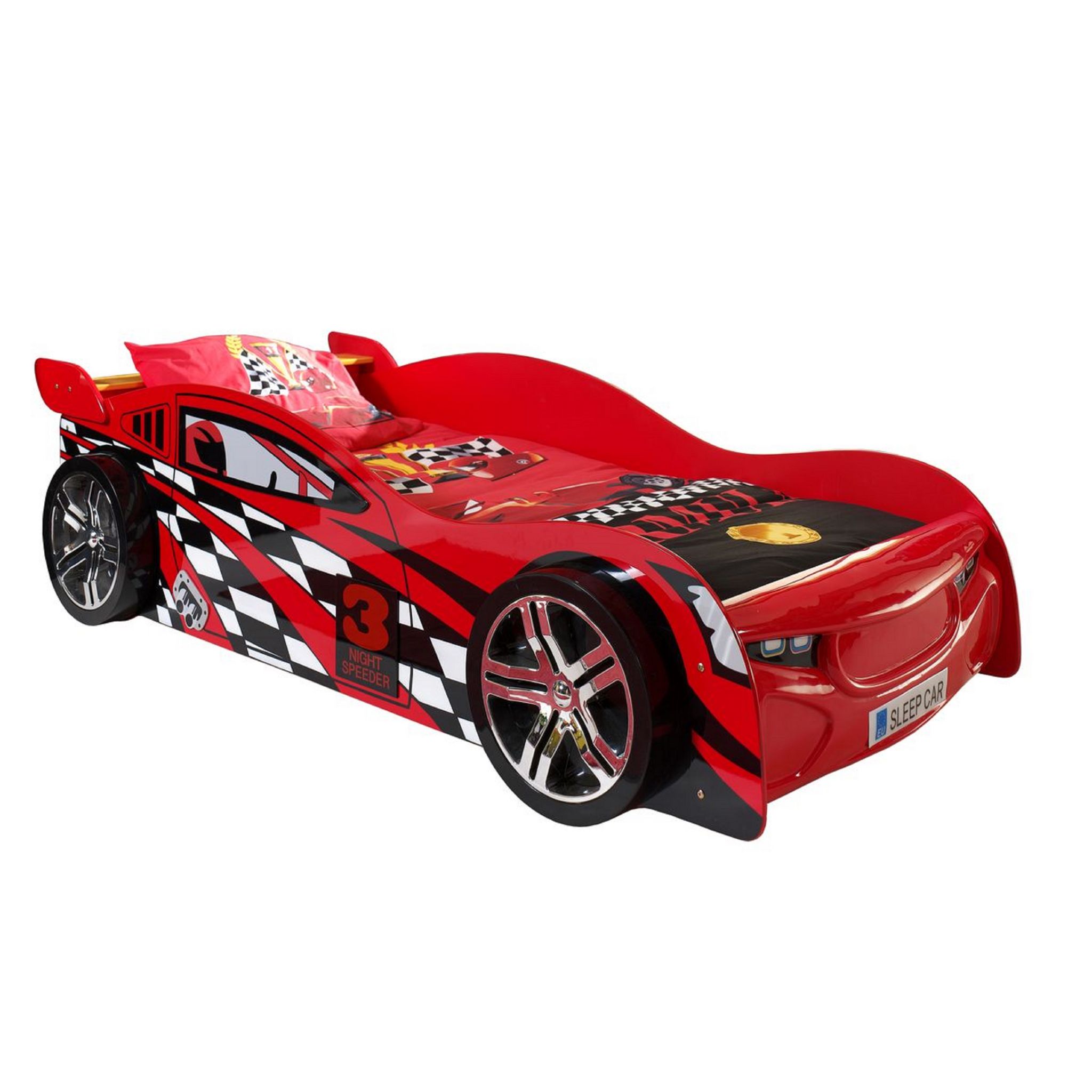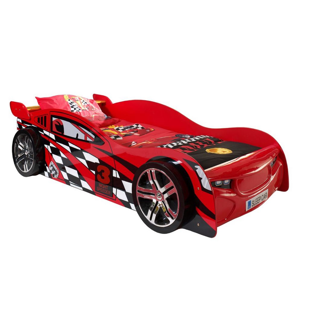 Lit voiture Night Speeder rouge avec des jantes chromées et un spoiler rouge. Éclairage LED optionnel. Réalisé en MDF, le lit voiture Night Speeder enchantera tous les amateurs de voitures de sport. Et vous serez sans aucun doute conquis par la qualité du lit. Les bords surélevés garantissent la sécurité de votre trésor. Le sommier est inclus. Matelas (90x200cm) non inclus. Nous vous recommandons le matelas Comfort. Côté déco, ce lit enfant est également embelli de jantes chromées et d'un spoiler rouge. Et pourquoi ne pas commander l'éclairage LED qui est optionnel? Votre bambin fera de beaux rêves grâce à ce magnifique décor!. Réf. VISCNS200R. Poids 54.64 kg. Marque Vipack. Longueur 229 cm. Largeur 110 cm. Hauteur 60 cm. Matériau MDF. Couleur Rouge. Thème Voitures et Moto's. Style Moderne. Type de lit Lit voiture. Dimensions matelas 90 x 200cm. Dimensions sommier Sommier inclus. Poids supportable 90kg. A monter soi-même. Livré sans matelas ni linge de lit ni accessoires