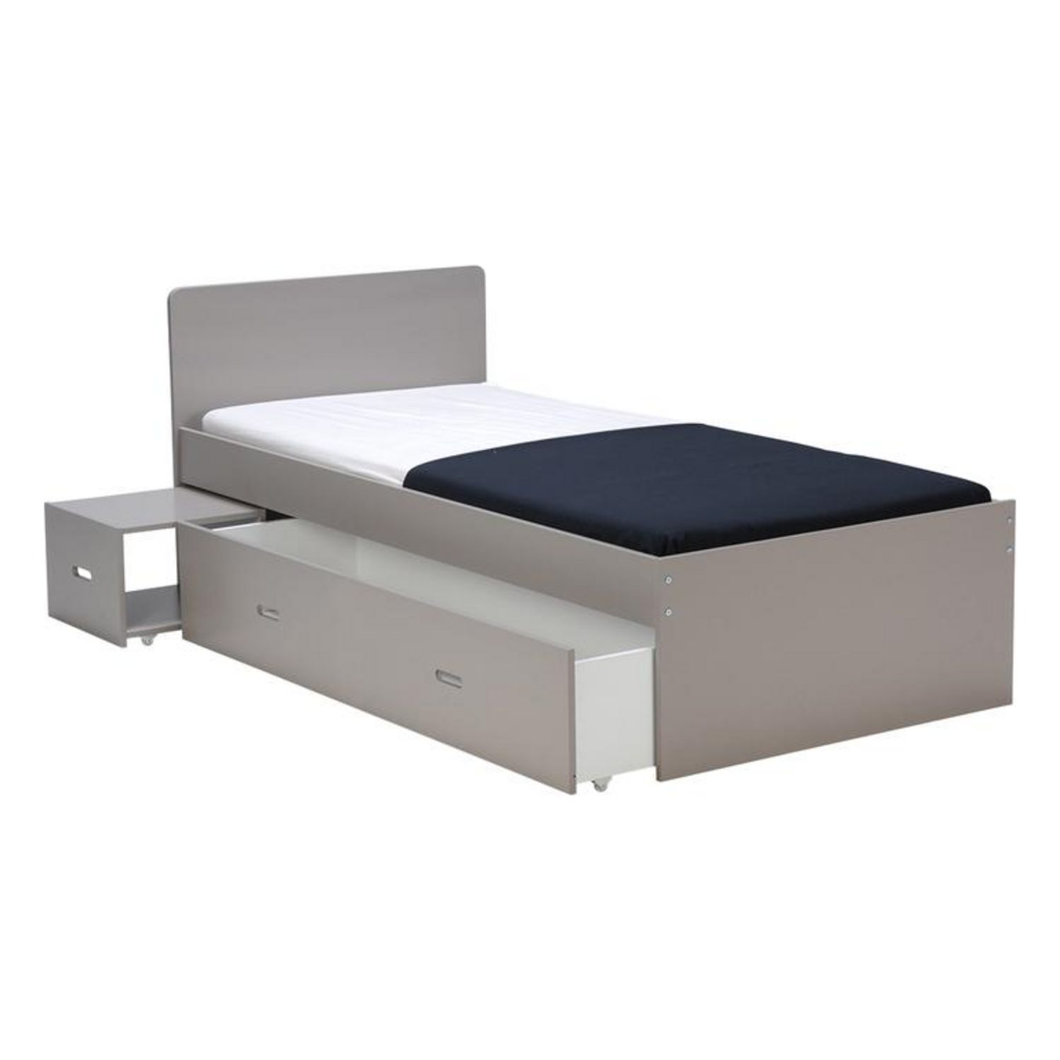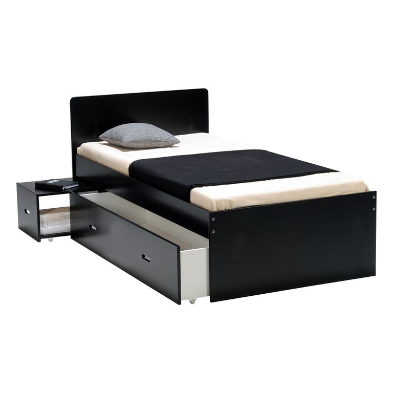 Lit enfant à tiroir + chevet XENA, en panneaux de MDF et panneaux de particules laqués. Une belle ligne toute simple, un tiroir et un chevet assorti sur roulettes. 3 coloris au choix : Blanc, Noir ou Gris !