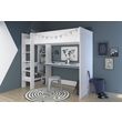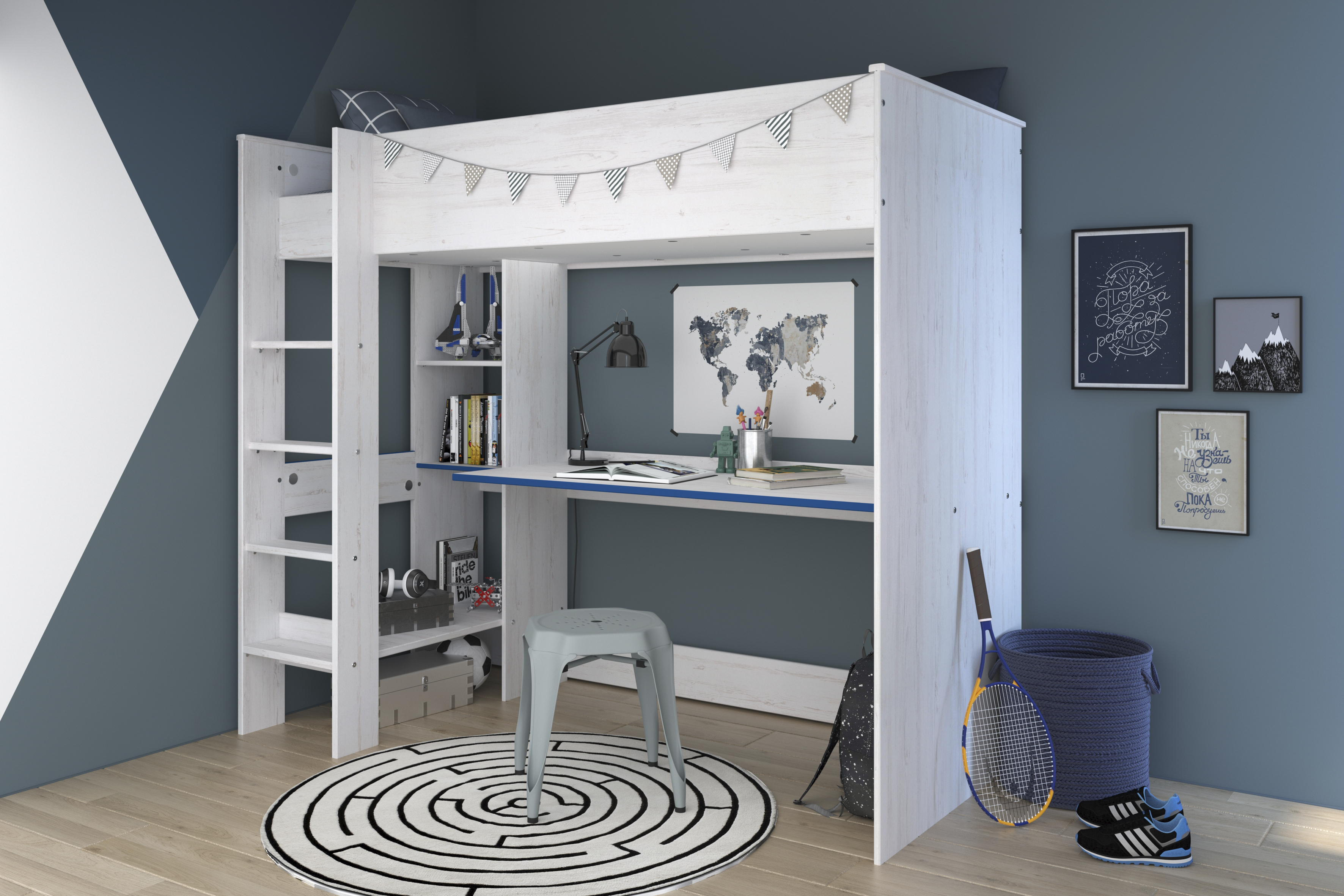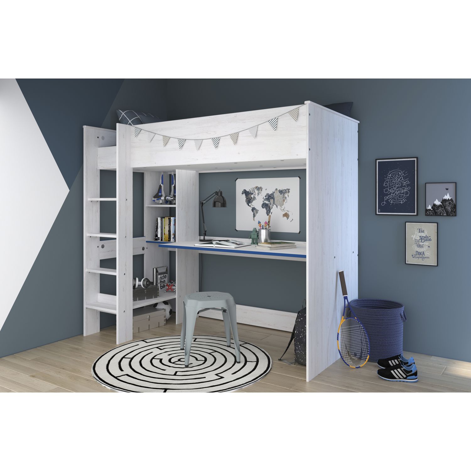 Lit mezzanine avec bureau et espaces de rangement. Coloris pin memphis. Finition rose ou bleu.