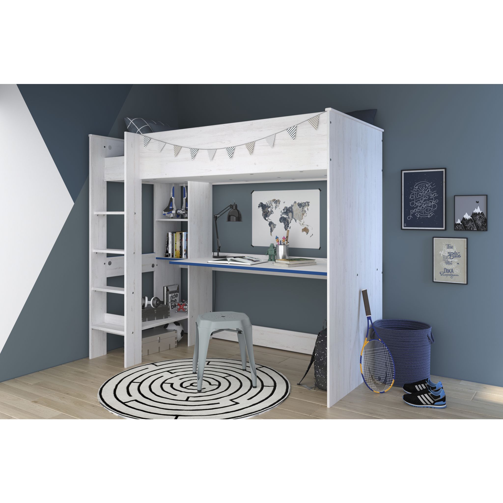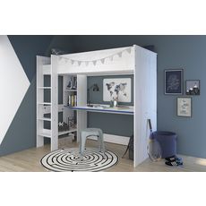 Un beau design coloré et épuré pour la chambre de votre petite fille ou de votre petit garçon. Entièrement de couleur blanche, ce superbe lit combiné deviendra l'aire de jeu et de travail de votre enfant. Grâce à ses chants mixtes, il s’adaptera aussi bien aux chambres des filles ou des garçons ! Effectivement, les bandelettes de couleurs rose ou bleu sur les extrémités en témoignent. Il s'agit d'un lit mezzanine dont la partie inférieure est occupée par un large bureau ainsi que quelques étagères de rangement très pratiques qui permettront de déposer livres, classeurs, et autres objets que votre enfant souhaite avoir à portée de main. Parfait pour constituer l'espace personnel de votre enfant, il ne demande qu'à être exploité. Vous ne serez plus confronté à un manque de place dans de petites chambres. Avec un minimum de meubles, vous disposez quand même d’une chambre d’enfant complètement équipée où votre enfant peut dormir, étudier et se détendre.