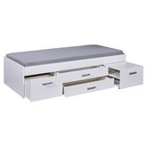 Le lit simple NAYA avec rangements intégrés et chevet sur roulettes offre une solution de couchage et de rangement idéale pour les petits espaces. Conçu pour s'adapter à une chambre d'enfant, d'adulte ou d'amis, ce lit de 90x200 cm combine fonctionnalité et esthétique. Son design épuré en décor blanc se marie aisément à tout type de décoration intérieure. La table de chevet, dotée de 2 niches ouvertes, s'intègre parfaitement sous le lit, optimisant ainsi l'espace disponible. Les 3 tiroirs spacieux du lit, facilement accessibles grâce à leurs poignées en plastique gris argent, offrent un espace de rangement supplémentaire pour le linge, les vêtements ou les jouets, permettant de maintenir l'ordre et la propreté dans la chambre. Ce lit multifonction est une excellente option pour ceux qui cherchent à maximiser l'espace tout en conservant un environnement organisé et stylé.