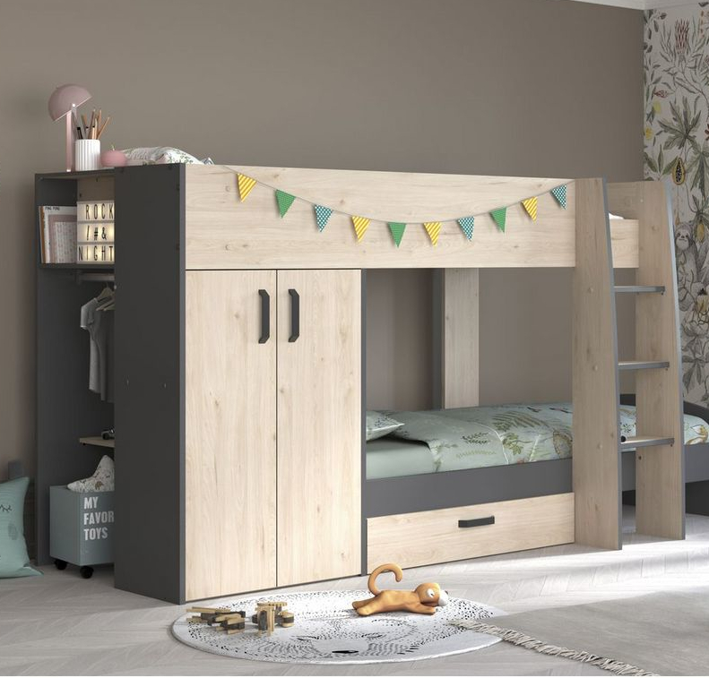 Optimisez l'espace avec notre lit superposé TIM de style industriel couleur chêne jackson et gris ombre . De fabrication Française, il est composé de bois/panneaux de particules. Pratique, il offre de multiples rangements comprenant un chevet, une armoire, une penderie et un tiroir.