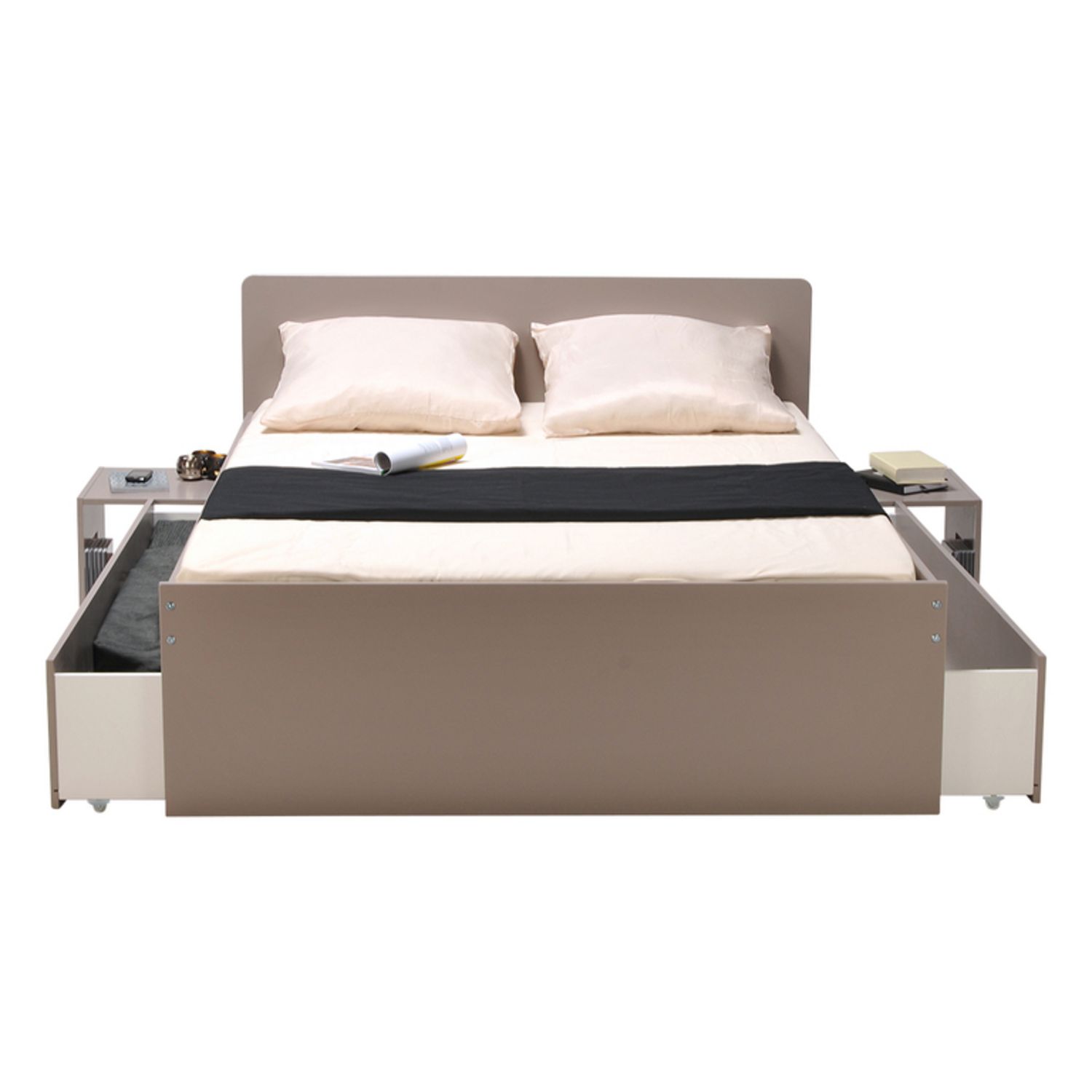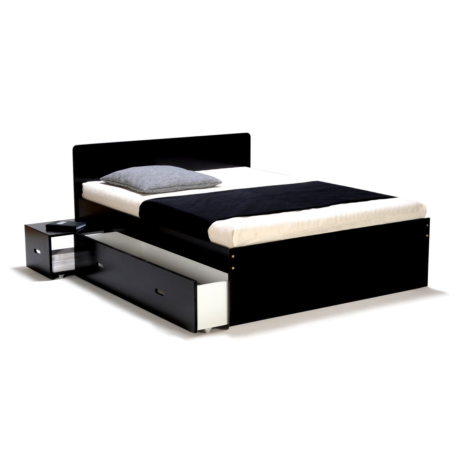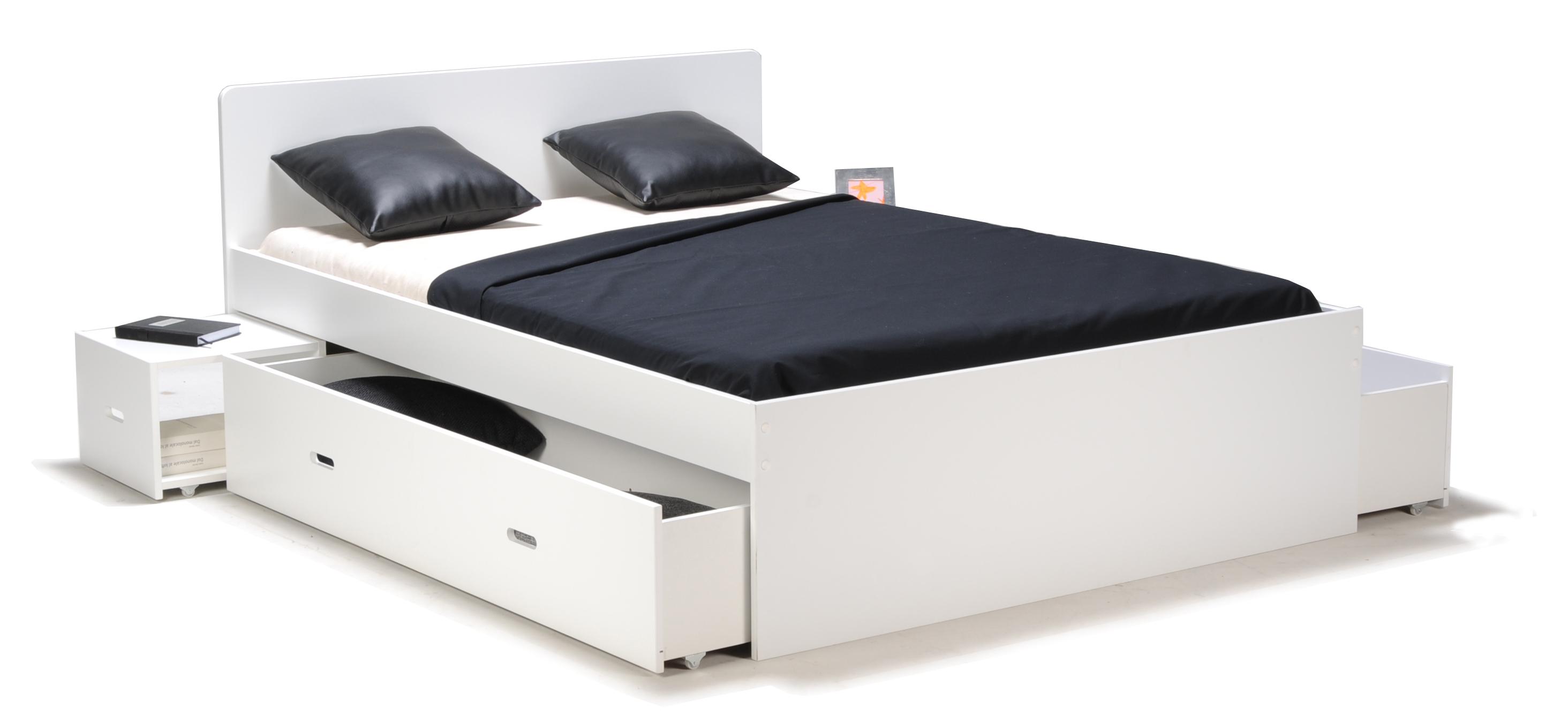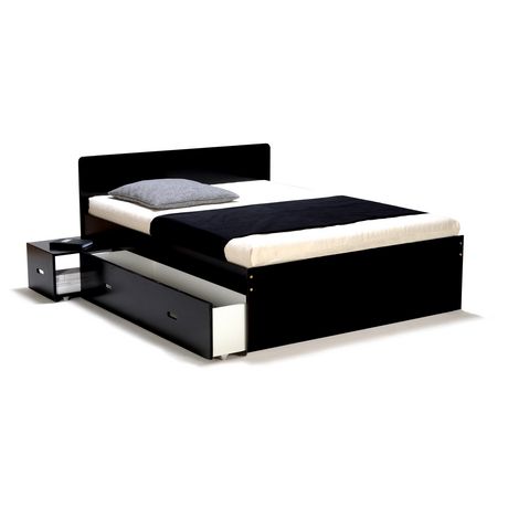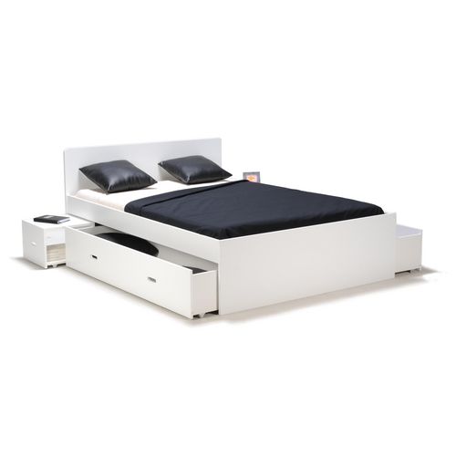 Lit adulte XENA Gris, Blanc, Noir est un lit double (140 x 190 cm) qui a tout bon : des chevets intégrés rétractables et 2 grands tiroirs pour le côté pratique, une ligne sobre et des couleurs chic pour l'allure.