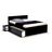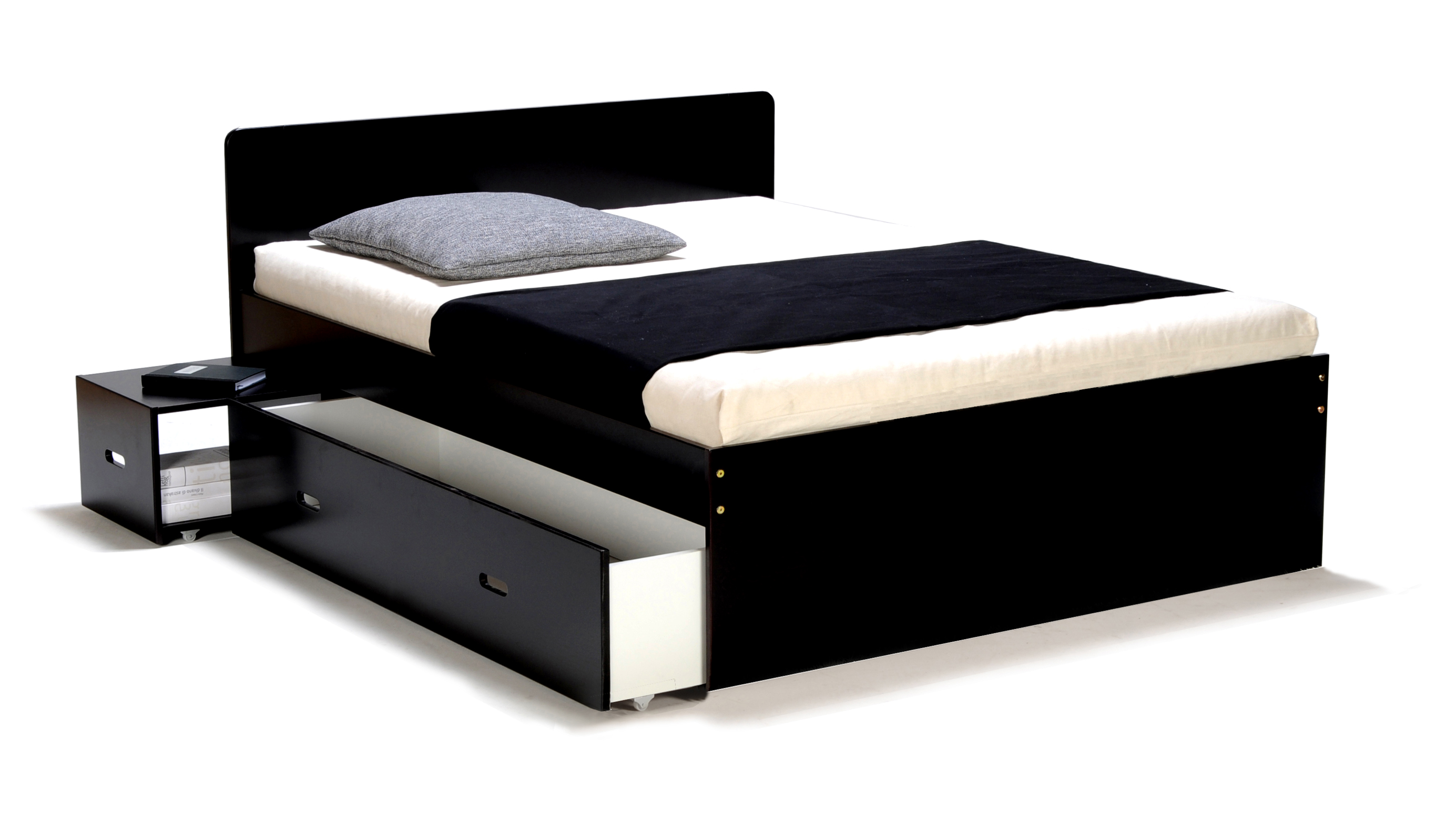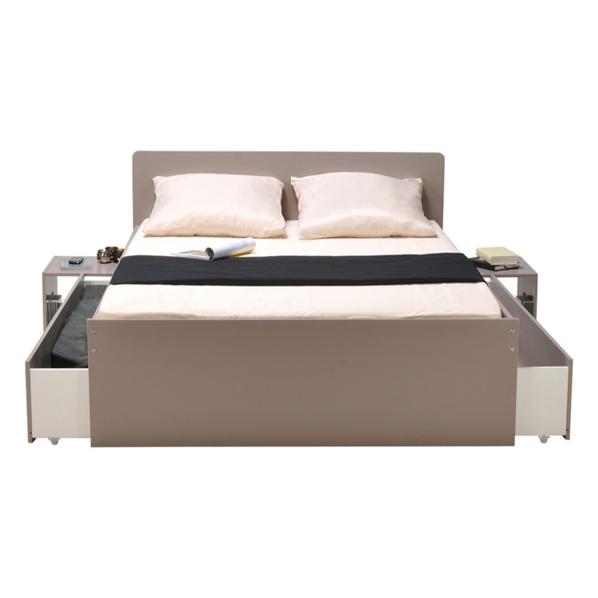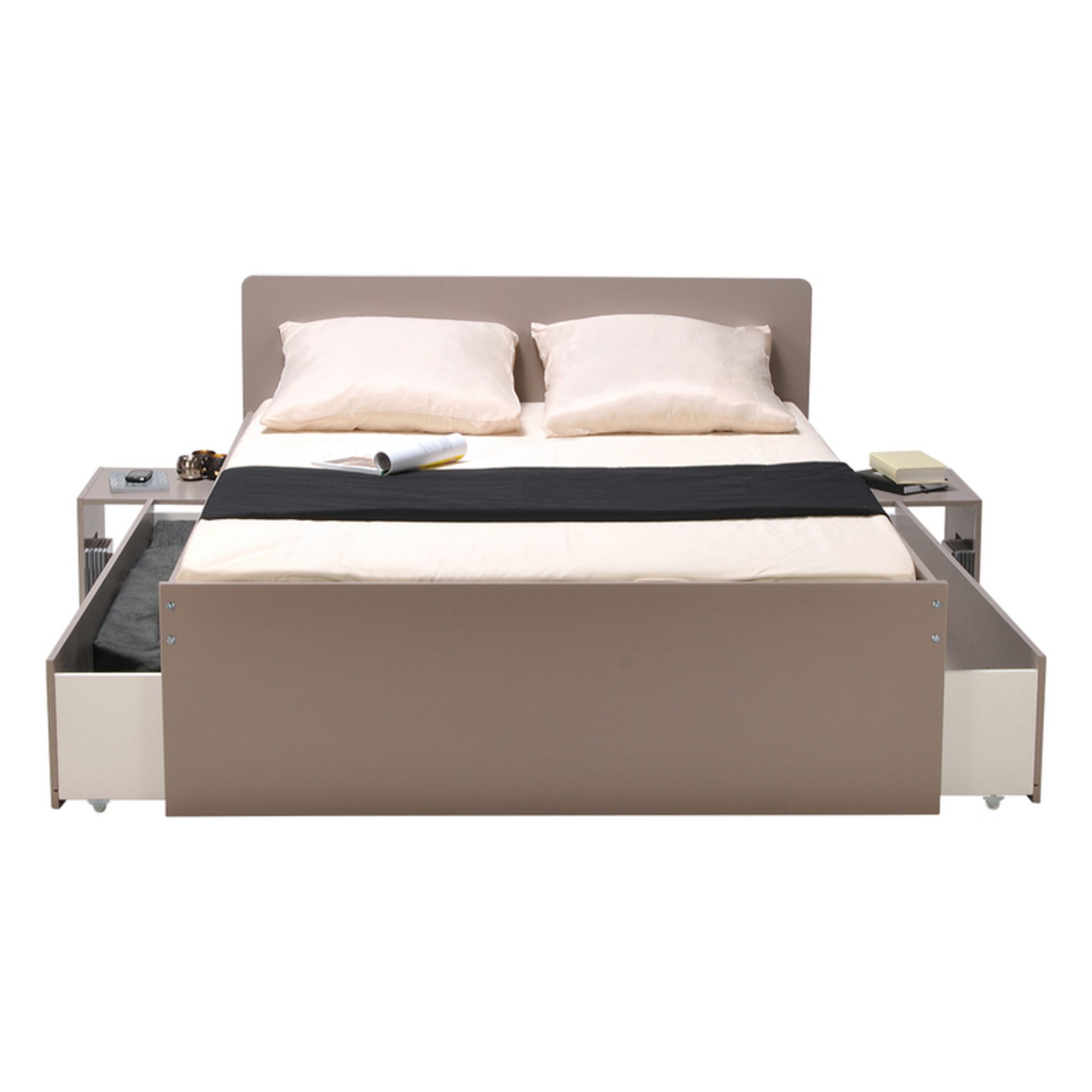 Lit adulte XENA Gris, Blanc, Noir est un lit double (140 x 190 cm) qui a tout bon : des chevets intégrés rétractables et 2 grands tiroirs pour le côté pratique, une ligne sobre et des couleurs chic pour l'allure.