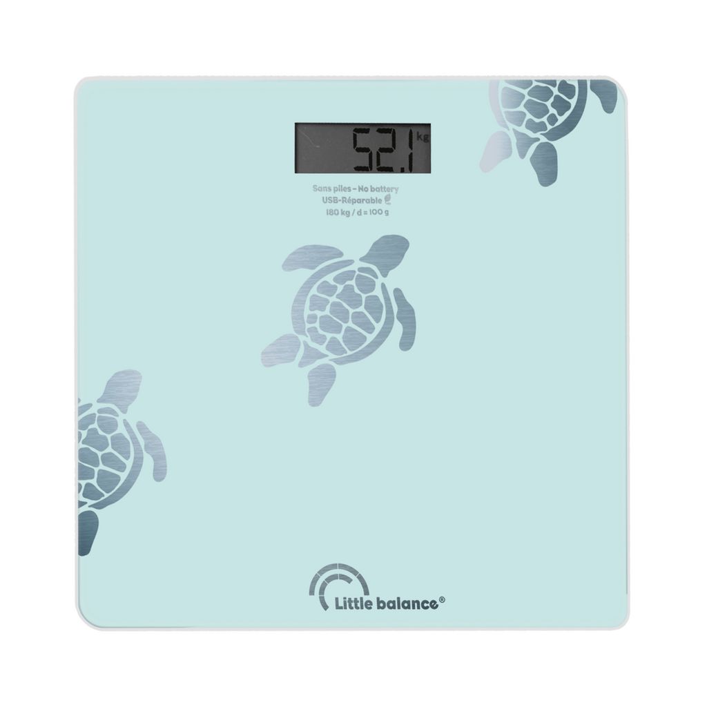 Little Balance 8730 La balance personnelle Little Balance 8730 Metallic Aqua Turtles est un modèle innovant aux motifs métalliques inspirants. Equipé d'une batterie USB rechargeable, il offre une grande fonctionnalité et une durabilité accrue. Avec une capacité de pesée allant jusqu'à 180 kg avec une précision de 100 grammes, il convient à un large éventail d'utilisateurs.