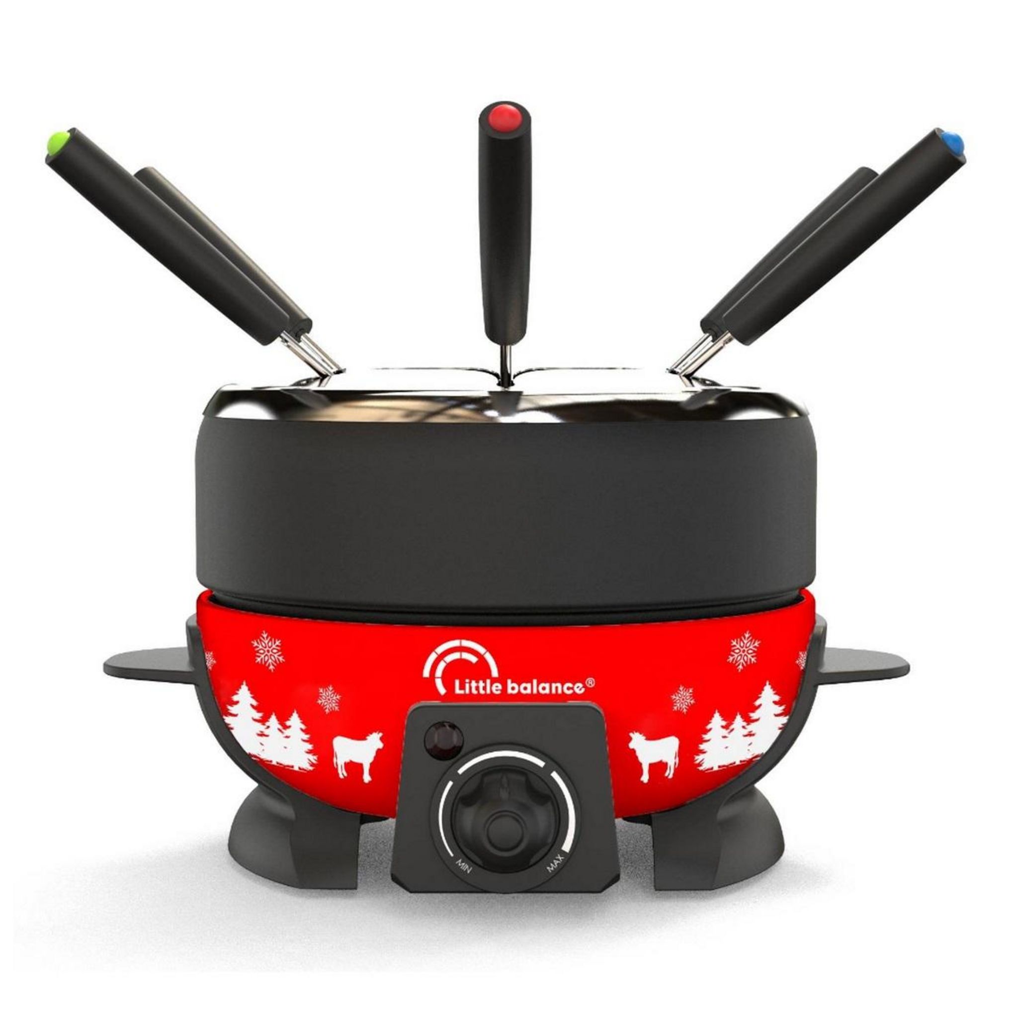 Little Balance 8689 Service à fondue Little Balance 8689 multifonctions : viande - fromage - chocolat. Une fondue avec un décor Montagne ! - Type de produit : Service à fondue.Puissance (en W) : 800.Capacité : 2 L.Pour 8 personnes.Caquelon antiadhésif.Couronne en inox.Thermostat réglable : Oui.Base
