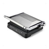 Le grill est équipé d'un écran tactile intuitif qui facilite la sélection des cinq programmes de cuisson préconfigurés ou la création de recettes personnalisées. Les plaques flottantes s'adaptent parfaitement à différentes épaisseurs de viande, et l'ouverture à 180° offre une surface de cuisson étendue. Le bac de récupération des jus est amovible, simplifiant le nettoyage.