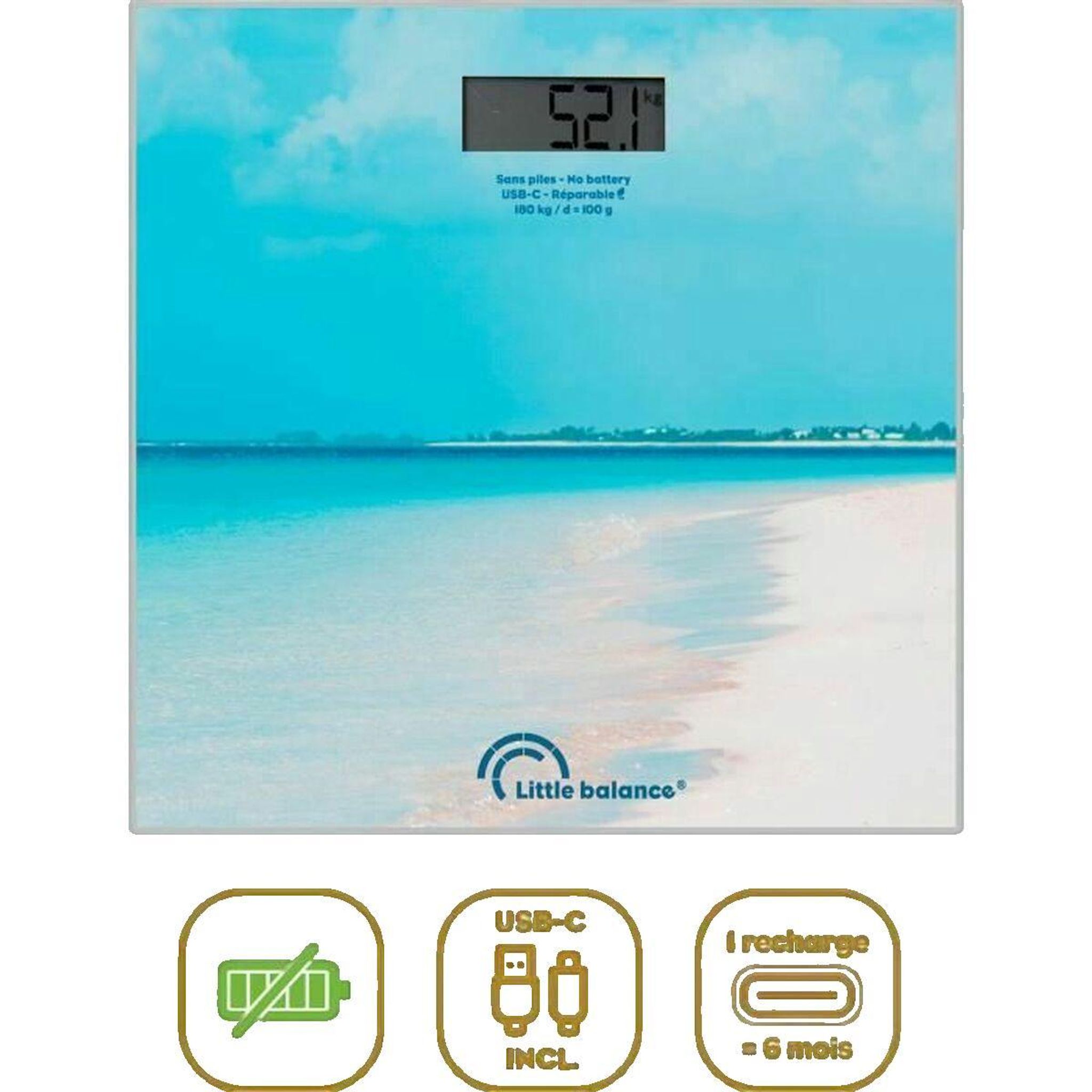 Le pèse-personne électronique Little Balance Caraïbes bleu est un appareil moderne et écologique, entièrement rechargeable via USB-C. Son plateau en verre trempé et son écran LCD offrent précision et élégance. Conçu en plastique recyclé, il supporte un poids maximal de 180 kg avec une précision de 1