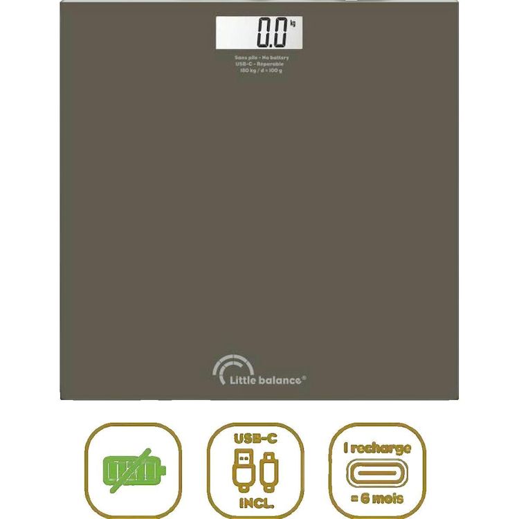 Le pèse-personne SB3 Tonka de LITTLE BALANCE est un appareil moderne et écologique conçu pour le suivi de santé. Il est rechargeable via USB-C, avec une batterie Li-Ion remplaçable pour une longue durée d'utilisation. Sa structure est en plastique recyclé, réduisant son impact environnemental. Il offre une précision de 100 g et une capacité maximale de 180 kg. Le plateau est en verre trempé de 28x28 cm, assurant robustesse et esthétisme. Son écran LCD est facile à lire. Cet appareil est idéal pour un usage quotidien dans toute salle de bain.