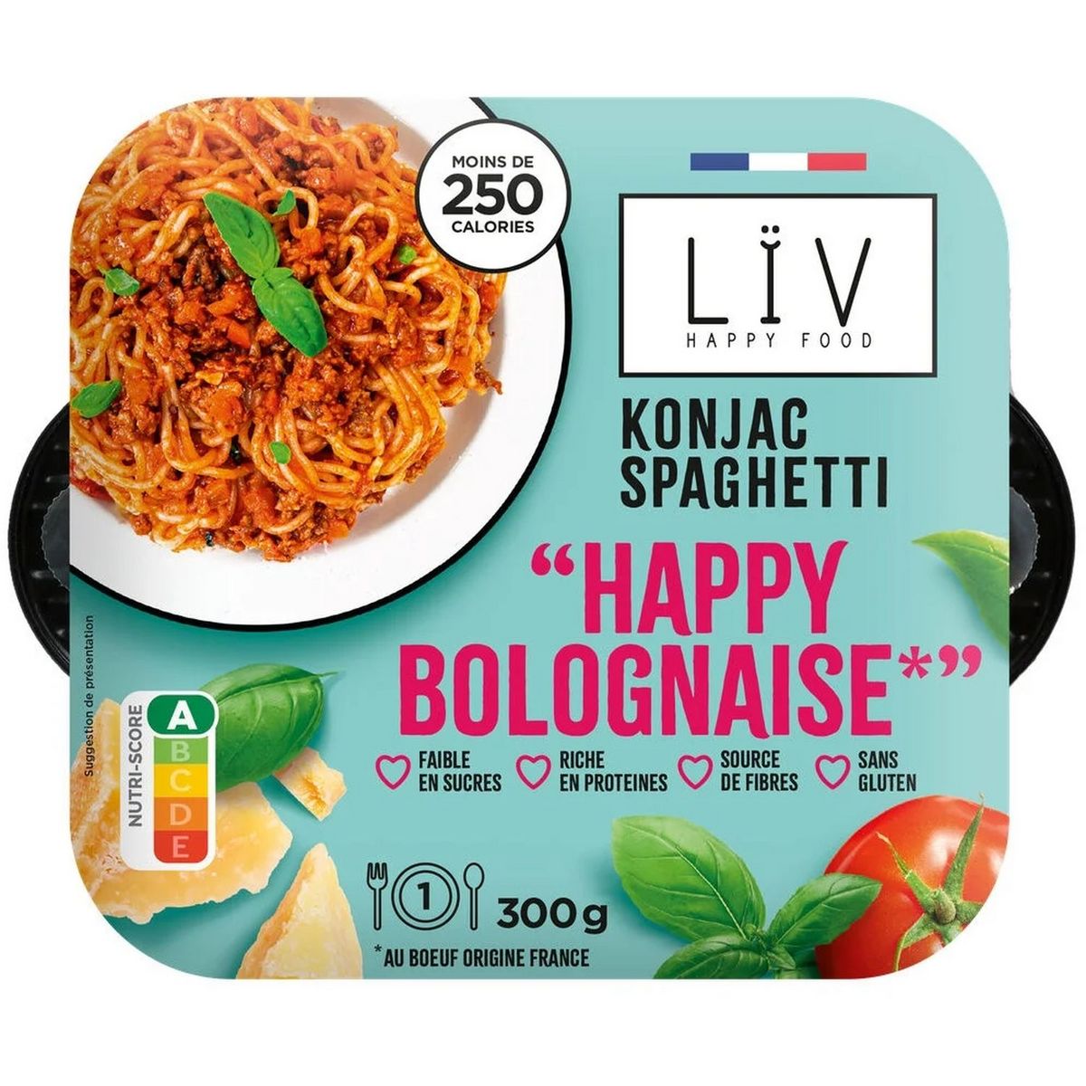 Ingrédients : Spaghetti de konjac* 43.4% (eau, farine de tapioca, farine de konjac 3%, gomme de caroube, bêta carotène), purée de tomates** 22.6%, viande de bœuf*** 11.5%, oignons, carottes, double concentré de tomates** 2.8%, vin blanc, parmesan AOP 2.2%, huile de tournesol, fécule de pomme de terre, basilic, sel, eau, ail, origan, herbes de Provence, paprika fumé, poivre.