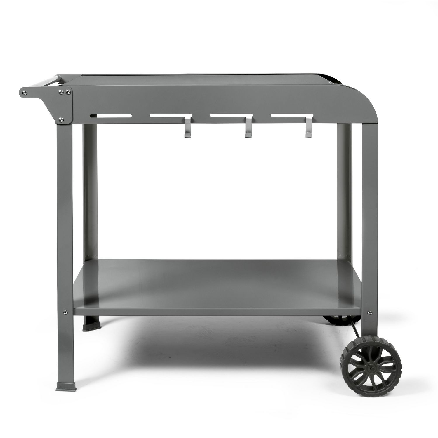 Livoo GS168G Desserte pour plancha Livoo GS168G offre un espace de travail généreux avec un plateau supérieur de 70 x 50, elle convient parfaitement aux planchas 2 ou 3 brûleurs. Pratique grâce aux 3 crochets ajustables, au panier intégré et au plateau inférieur de 79 x 49 cm. Facilement déplaçable avec les 2 roues crantées et la poignée latérale en acier inoxydable.