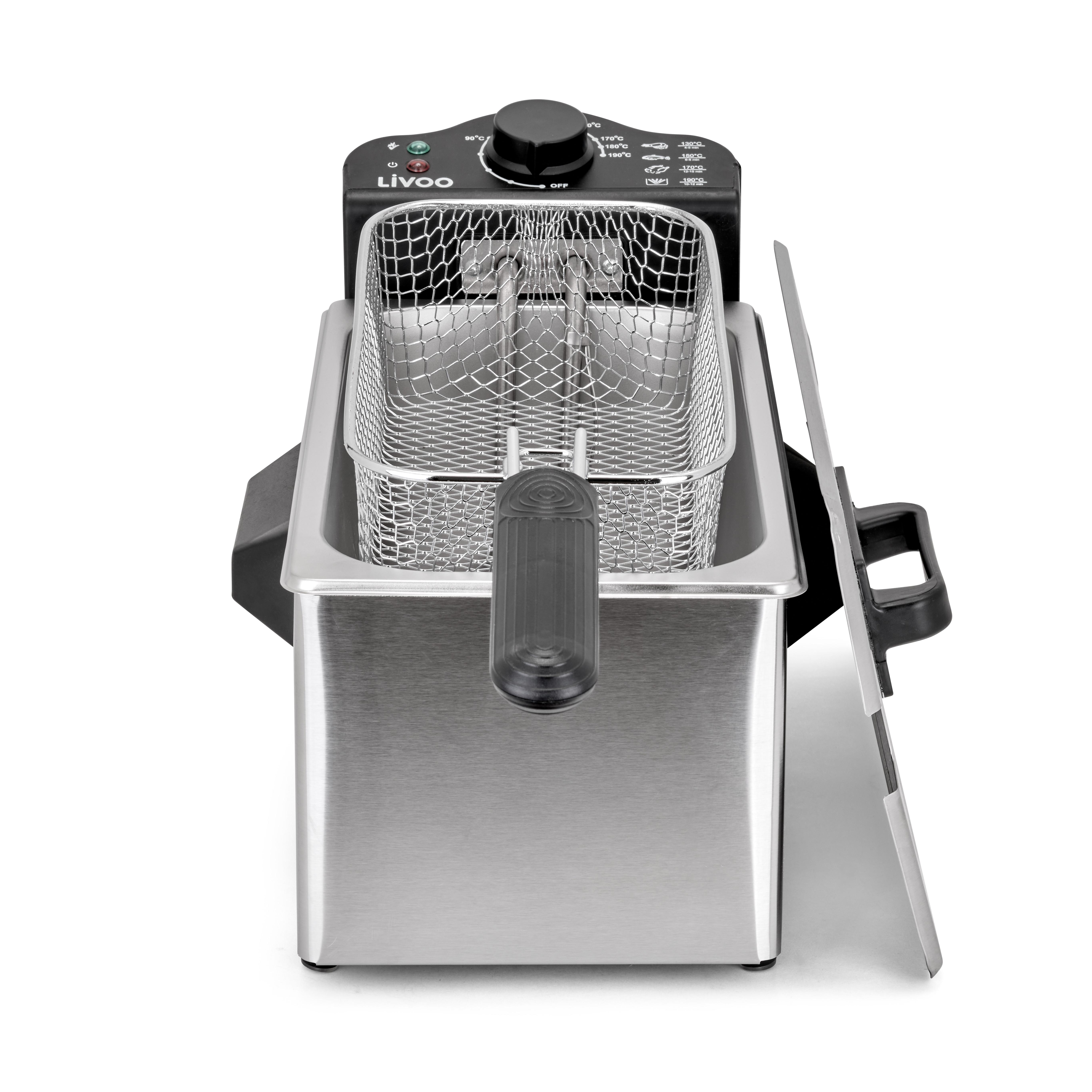 La friteuse Livoo vous séduira car son corps en acier inoxydable chromé. Avec une puissance de 2000W et une capacité de 3L vous allez pouvoir réaliser 0.8kg de frites. La friteuse dispose d'un thermostat réglable jusqu'à 190 degrès. La cuve à revêtement en acier inoxydable pour un entretien facile, le panier à friture dispose de poignée amovible.