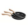 Livoo MEP114 Set de 3 poêles Kitchen Artist MEP114 sont dotées de revêtement intérieur antiadhésif finition aspect pierre, manche revêtement silicone aspect bois, et cuisson sans ajout de matière grasse.