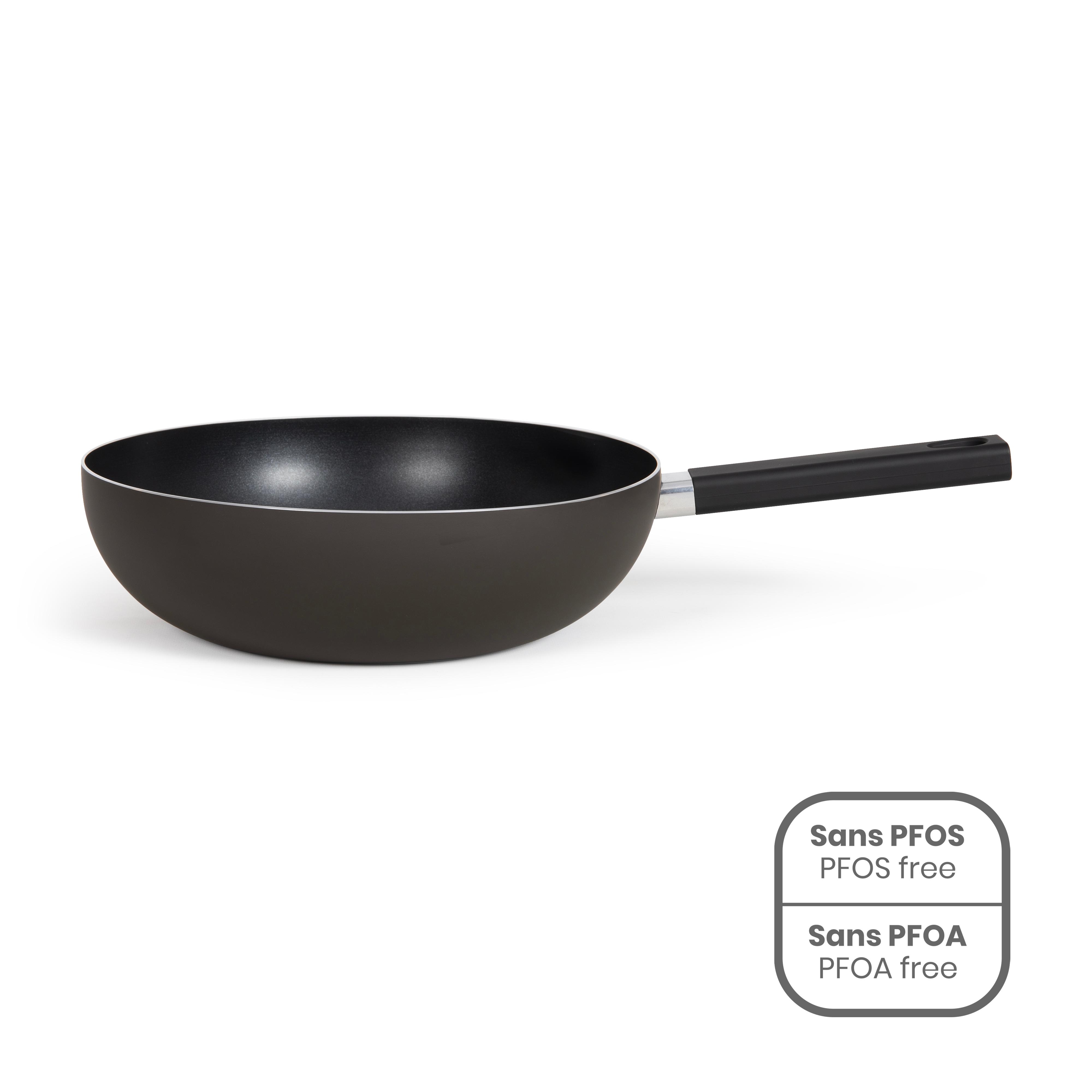 Wok en aluminium au revêtement antiadhésif sans PFOA ni PFOS, pour cuire facilement tout type d'aliment sans ajout de matière grasse.