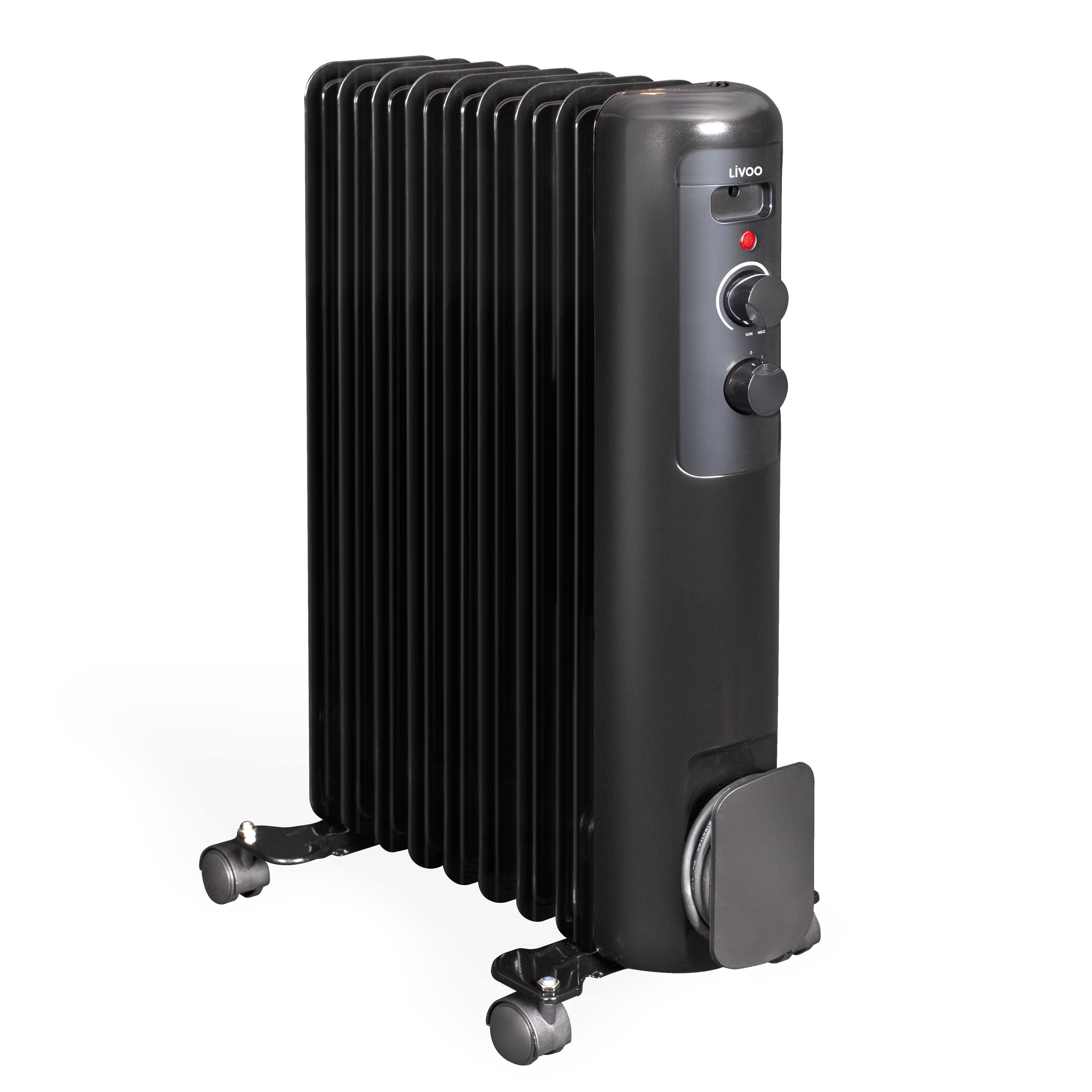 Livoo DOM502 Radiateur bain d'huile DOM502 de Livoo possèdent d'une puissance maximale de 2000 W et avec 9 ailettes permettant de chauffer jusqu'à 20 m?2,. Panneau de contrôle latéral avec 3 niveaux de chauffe et thermostat ajustable pour adapter l'intensité de chaleur aux besoins de chacun. Facile à déplacer et à ranger, grâce aux roulettes et à l'emplacement de rangement du câble.