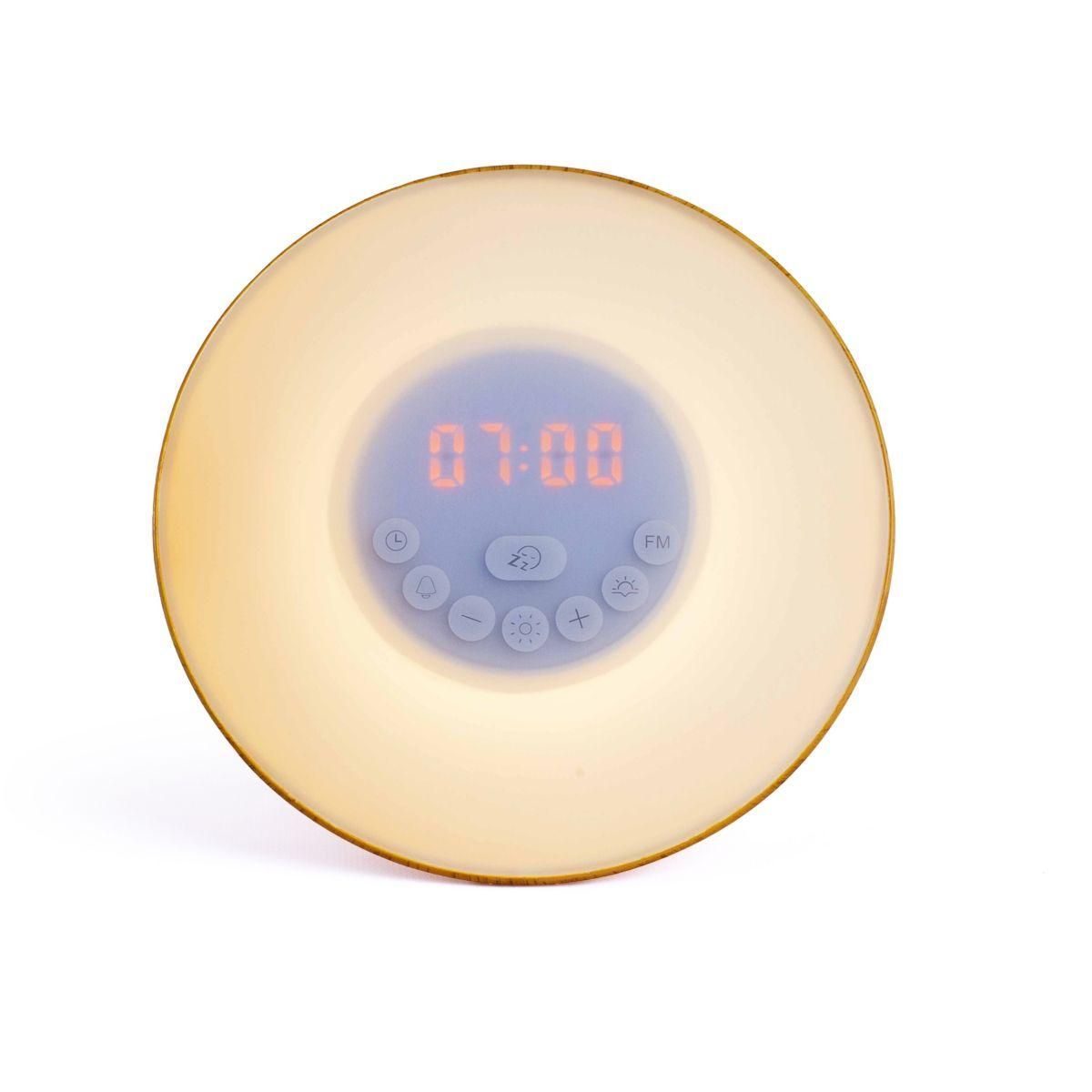 La durée de garantie est de 2 ans. Les + de ce modèle Avantages - Recherche automatique des fréquences - Mémorisation de 20 stations FM - Alimentation de secours sur piles (non fournies) - 110 lux, 70 lumens Caractéristiques générales Type Simulateur d'aube Couleur Bois Rétroéc