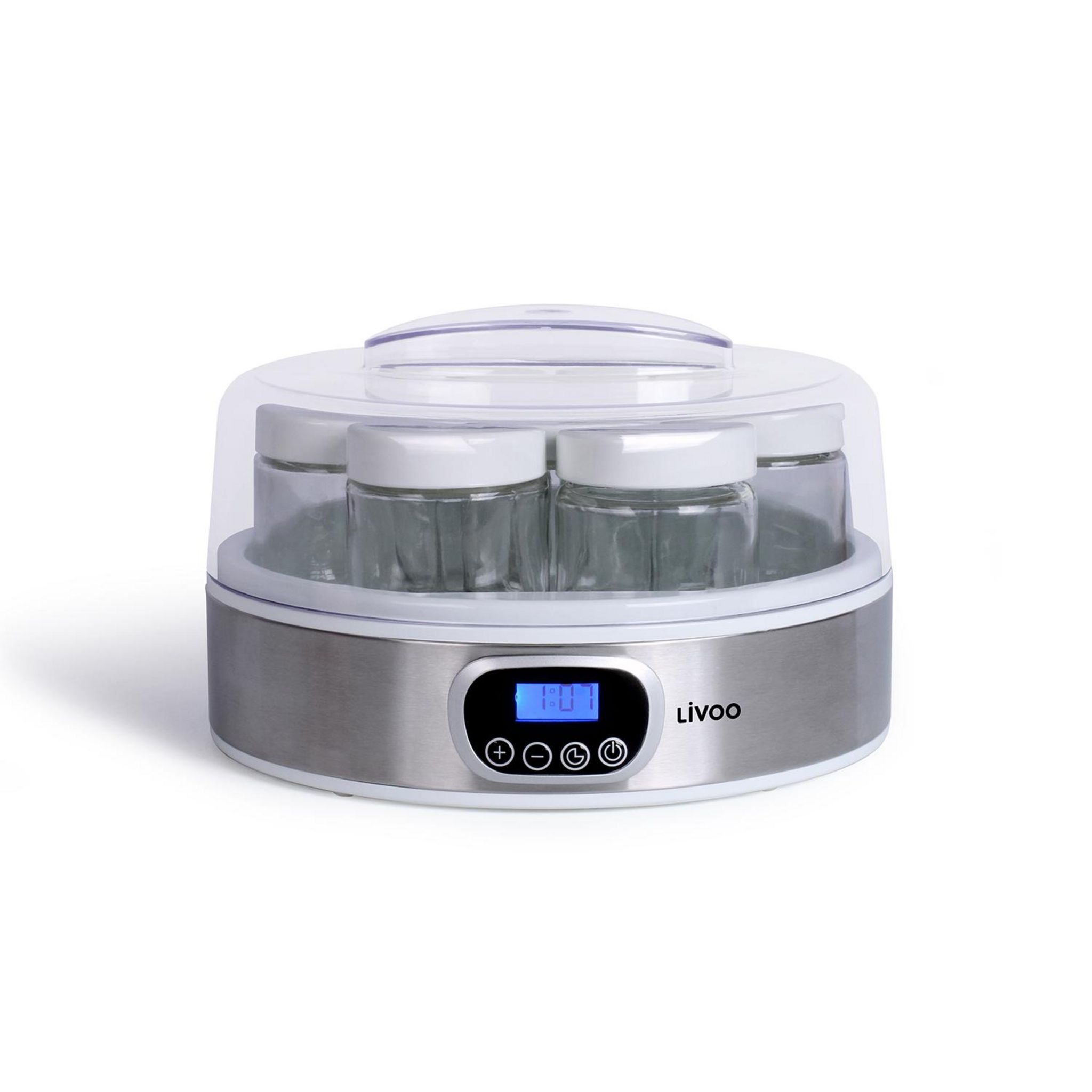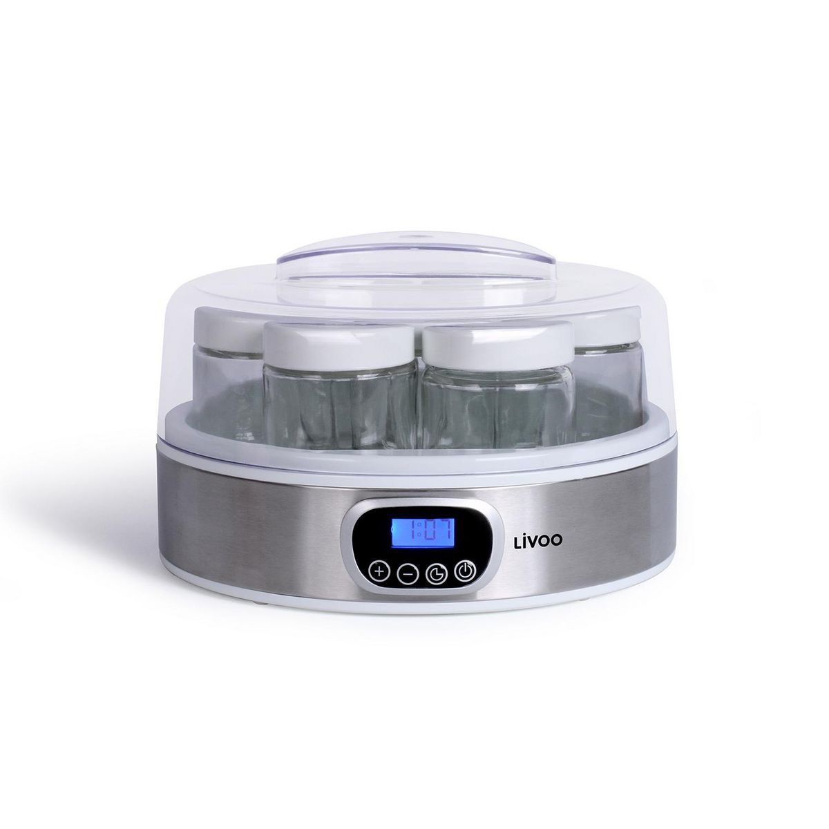 Livoo DOP216 - YaourtièrePuissance : 18 WProgrammable jusqu'à 14 heures grâce à sa minuterieArrêt automatique avec signal sonore7 pots en verre avec couvercle à visserCapacité par pot : 200 mlCapacité totale : 1400 mlAffiche digital60 étiquettes inclusesPots compatibles lave-vaisselleDimensions : 2