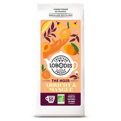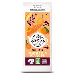 Ingrédients : Thé noir d'Inde* (91,5%), arômes naturels de (mangue* (3%), abricot* (2%)), dés d'abricot* (3%), pétales de souci*.