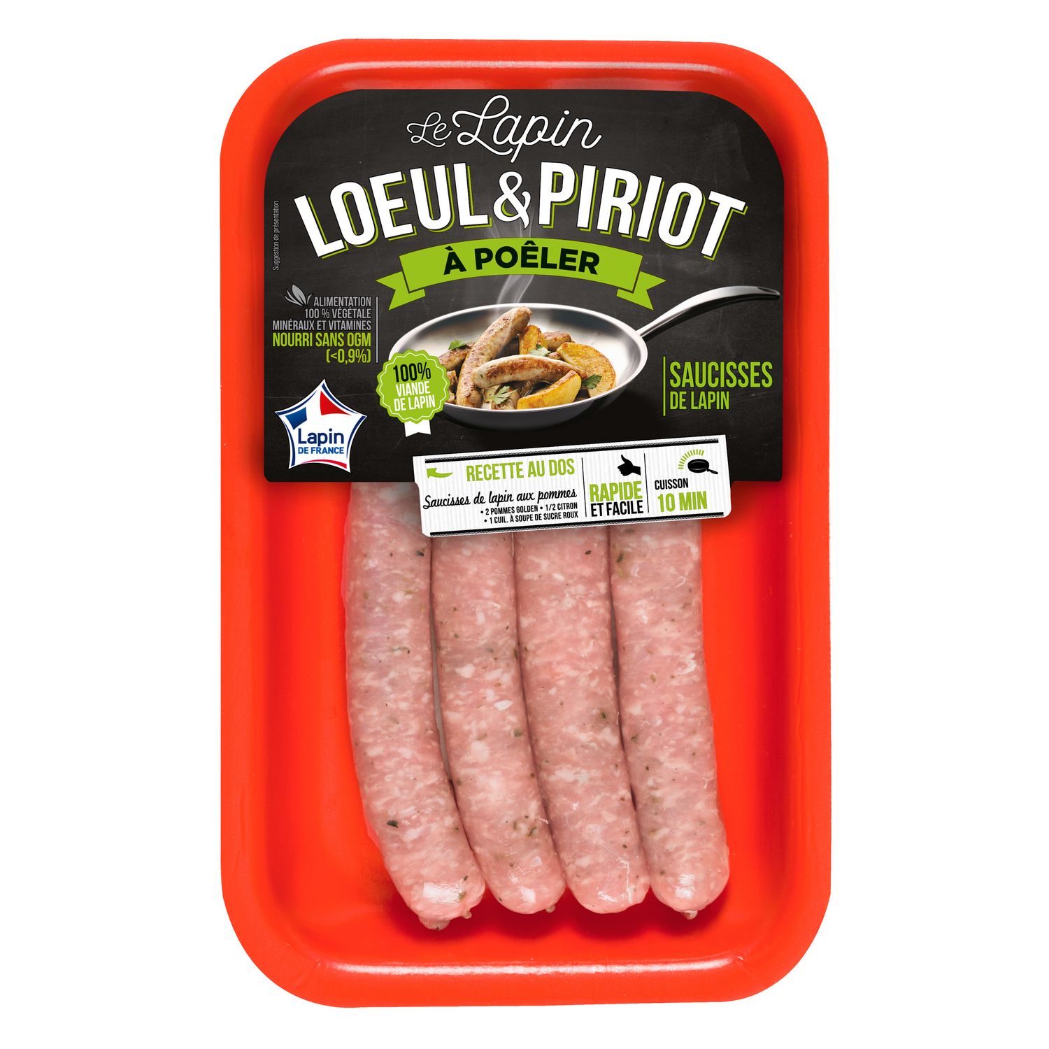 Ingrédients : Viande de lapin (88 %), eau, boyau naturel de mouton, sel, herbes de Provence 0,12% (romarin, thym, origan, basilic, marjolaine), poivre, épices, dextrose, arômes naturels, vinaigre, betterave