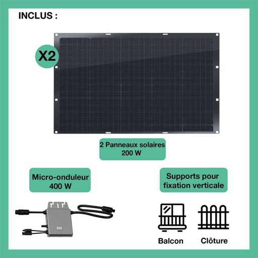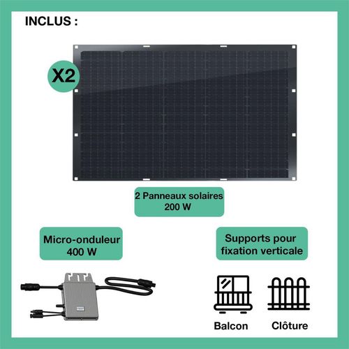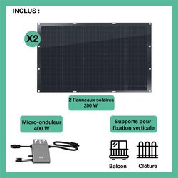 | Avantage | Kit solaire flexible 400W Full black Cellules PERC avec supports inclus pour fixation verticale (balcon, clôture). Module Plug & Play - Suivez-votre production à distance grâce à notre application TSUN SMART. | |