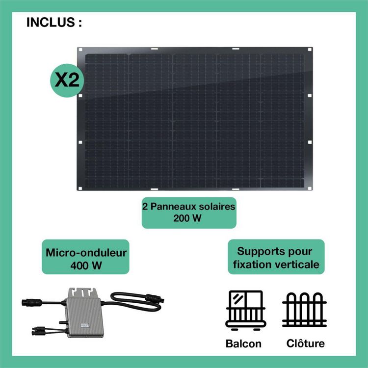 La durée de garantie est de 2 ans. Caractéristiques générales Type produit panneau solaire Avantage Kit solaire flexible 400W Full black Cellules PERC avec supports inclus pour fixation verticale (balcon, clôture). Module Plug & Play - Suivez-votre production à distance grâce à notre appl