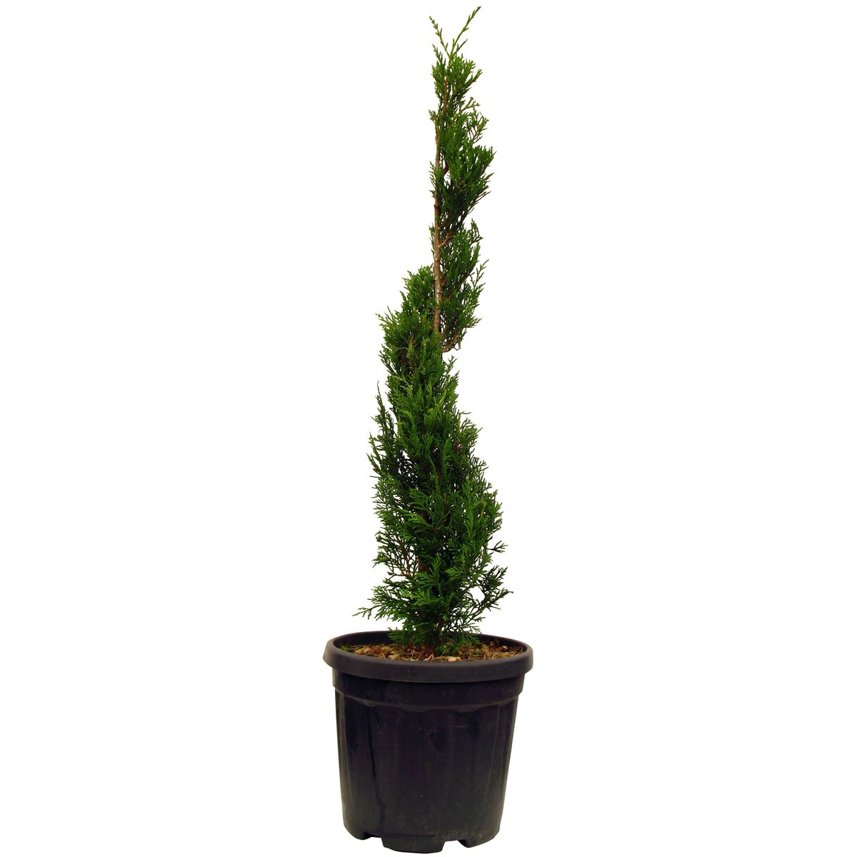 Conifère formé en spirale, il possède un feuillage persistant vert. Il doit être taillé régulièrement, afin de garder sa forme. Ce joli conifère pourra être placé devant l'entrée d'une maison, en rocaille, alignement ou isolé. Il s'agit d'un lot de deux plants.