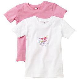 Voilà des t-shirts enfant fille parfaits pour l'été (vendus par lot de 2) ! T-shirts fille ultra-confortables à manches courtes, col rond, imprimé devant. Coutures doubles pour plus de résistance. T-shirts en pur coton, à laver en machine, à 40°.