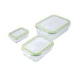 Fini le plastique, oui à la protection de la planète ! 100% saines, des boîtes dotées d'un couvercle à valve pour une conservation sous-vide des aliments (jusqu'à 5 fois plus longtemps !). En verre très résistant aux chocs et à la chaleur, elles passent sans problème du congélateur au micro-ondes et au lave-vaisselle, et elles sont aussi parfaites pour emporter son repas au bureau ! Pack de 3 boîtes rectangulaires, contenance 1,5 l, 0,63 l et 0,18 l.