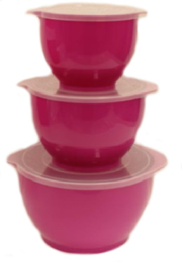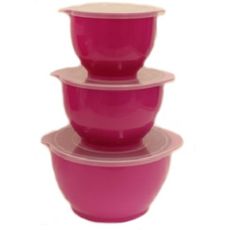 Lot de 3 bols à mixer avec bec verseur et un couvercle en plastique par taille. Couleur rafraichissante. Tailles : 1.2L, 2L, 3.4L