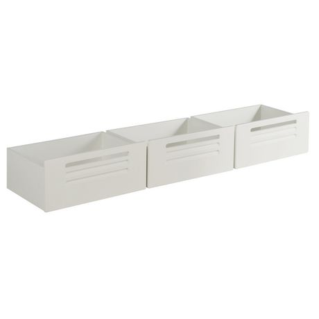 Chambre CARGO avec des façades blanches et des caisses imitation métal et pieds métal dans l’esprit atelier, une chambre pour tout ranger. Le lot de 3 tiroirs pour lit CARGO dispose de dimensions qui permettent de les installer côte à côte.