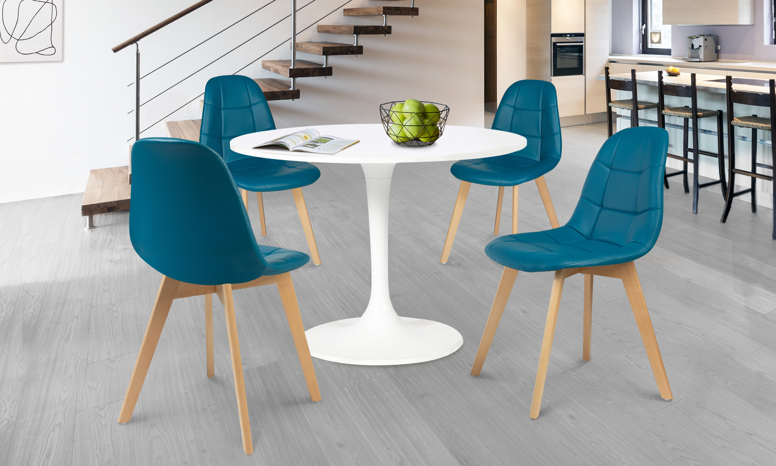 Les chaises Carla offrent stabilité grâce à un piètement en bois massif solide. Mais aussi confort avec une assise en PU matelassé. Facile d'entretien, elle se nettoie facilement et pourra se marier parfaitement autour d'une table en bois.