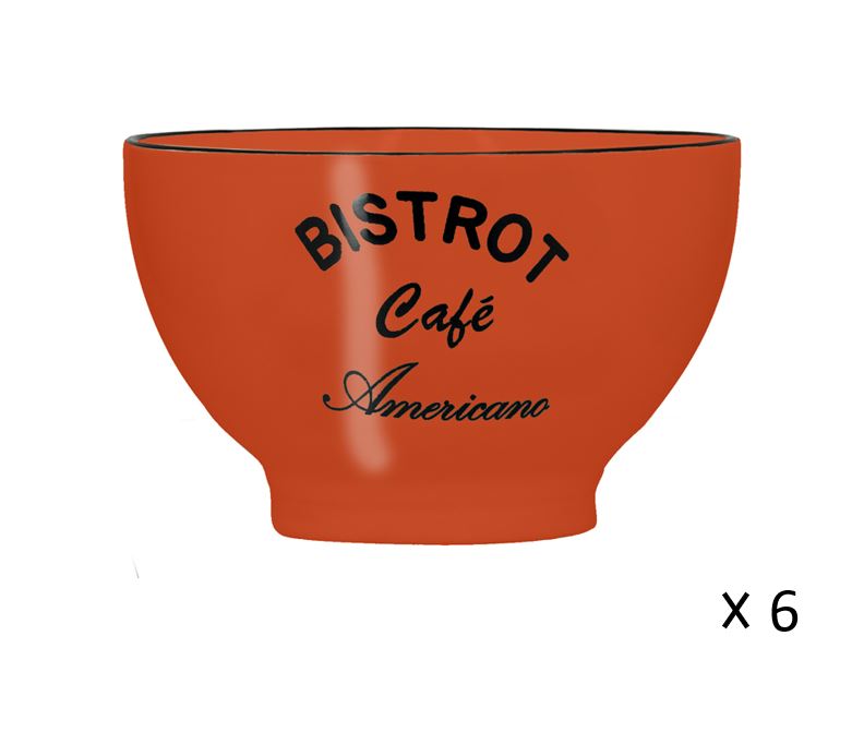 Découvrez ce lot de 6 bols 50 cl (13 cm) BISTROT en grès couleur Orange. Retrouvez tout le charme et l'ambiance chaleureuse des bistrots avec cette tasse au look délicieusement rétro avec inscription "Chocolat Chaud". Compatible lave-vaisselle et micro-ondes.