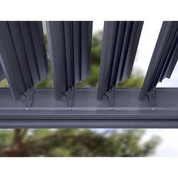 Structure aluminium, dimensions : 400x300x223 cm, pieds 100x100, barre transversale 115x100, lattes d’aluminium inclinables parfaitement étanche une fois fermée, évacuation de l’eau par gouttière et pieds, ouverture et fermeture manuelle, rideaux en polyester 200 grs/m² protection UV80 et déperlant, moustiquaire en polyester 40 grs/m131