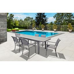 Structure en aluminium, allonge automatique, peinture époxy grise, verre trempé texturé, assise en textilène