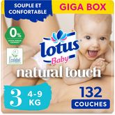 Couches Lotus Baby Natural Touch Taille 3 (4-9 kg) Giga Box x132 Des couches parfaitement ajustées qui respectent la peau de bébé Souple et confortable pour s’adapter aux mouvements de bébé 0% lotion, parfum, colorant en contact avec la peau atières ultra douces à l’intérieur et à l’extérieur de la couche Système anti-fuites jusqu’à 12h Des couches sans chlore élémentaire Testé dermatologiquement et accrédité par la Skin Health Alliance Couches certifiées Ecolabel et ouate de cellulose certifiée FSC