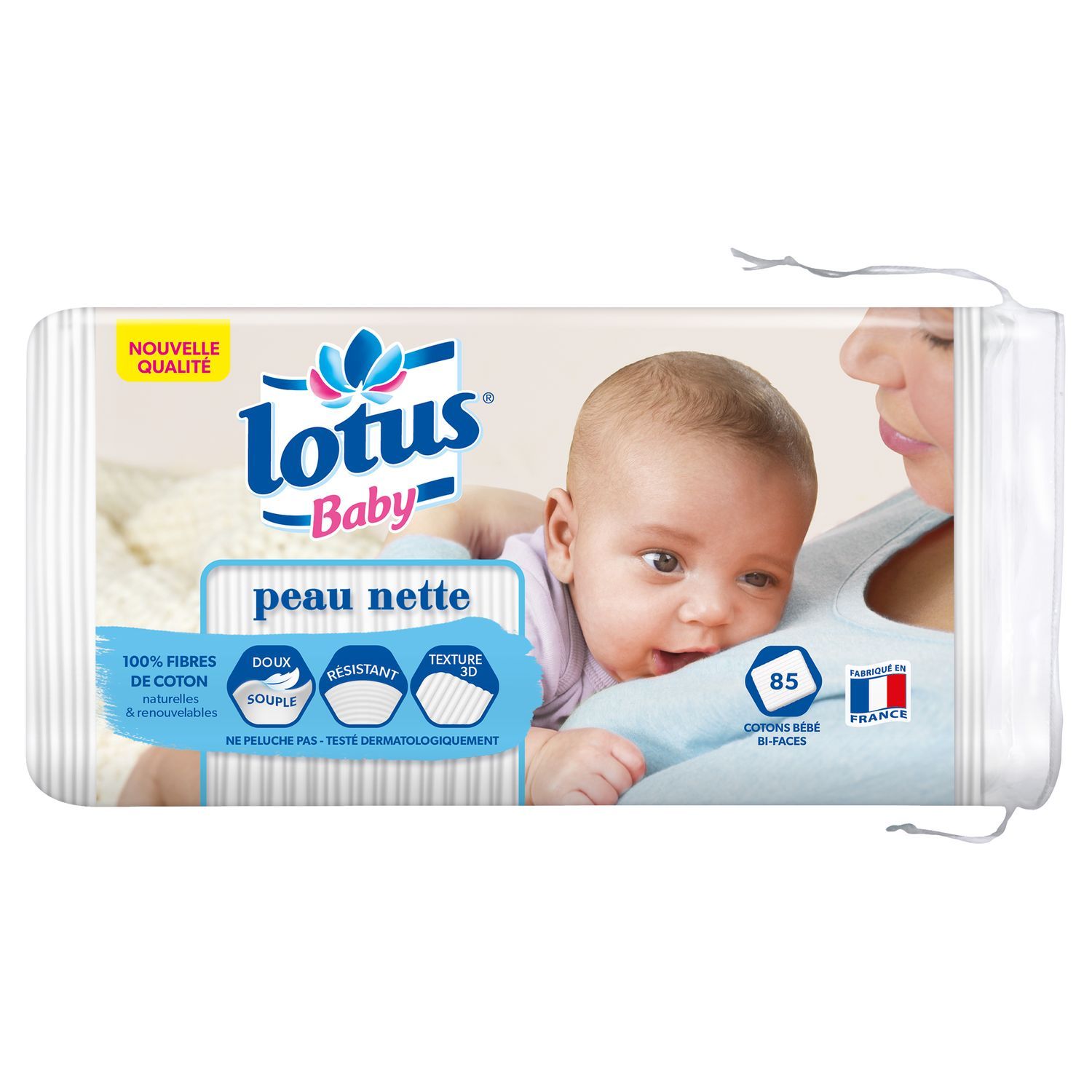 Coton Bébé Lotus Baby Peau Nette x85 carrés Les cotons bébé Lotus Baby Peau Nette sont encore plus souples et toujours aussi doux, pour faciliter le change de votre bébé tout en respectant sa peau fragile. Ils sont aussi très résistants et ne peluchent pas, pour assurer à votre tout-petit une propreté impeccable. Leur texture 3D est idéale pour nettoyer parfaitement la peau de bébé, alors que leur face lisse permet une toilette tout en douceur. Testés dermatologiquement et composés à 100% de fibres de coton naturelles Fabriqués en France