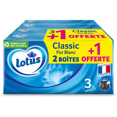 Les mouchoirs LOTUS® vous offrent douceur, confort et résistance, en toutes circonstances. Les boîtes de mouchoirs LOTUS® Pur Blanc se mettent à disposition de tous, dans la maison. Boîte Mouchoirs Lotus Pur Blanc 270+90