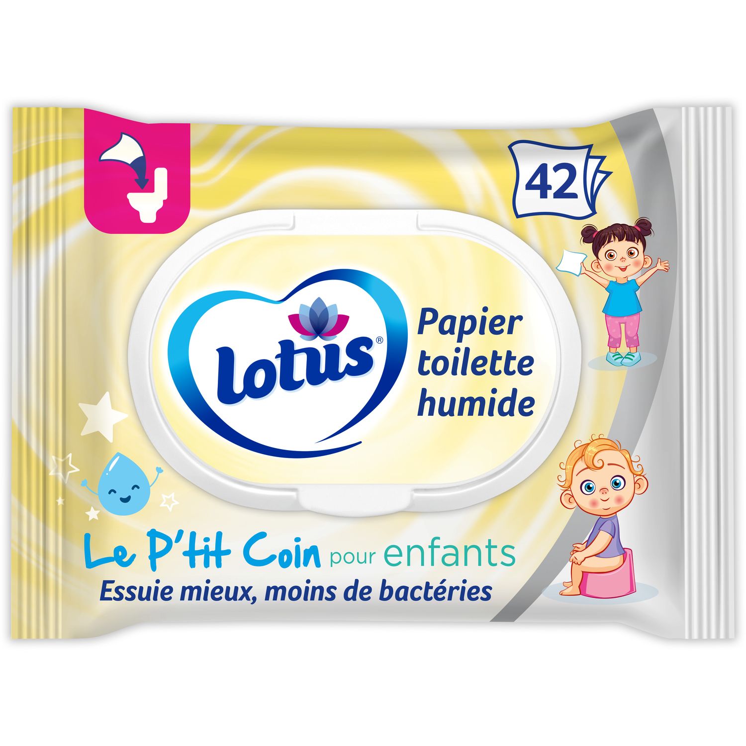 Apprendre la propreté, avec le papier toilette humide Lotus Le P’tit Coin c’est un jeu d’enfant ! Il est le complément idéal au papier toilette sec ! Le papier toilette humide Lotus Le P'tit Coin permet à votre enfant de devenir autonome, puis de le rester lorsqu'il grandit, toujours de façon ludique. Sa lotion ultra-douce prend soin de la peau sensible des jeunes enfants, tout en la nettoyant. Le complément idéal au papier toilette sec. 0% alcool, 0% colorant, 0% parfum. Respecte la peau sensible des jeunes enfants. pH neutre pour la peau, testé dermatologiquement. Papier Toilette humide Lotus Kids x42 feuilles